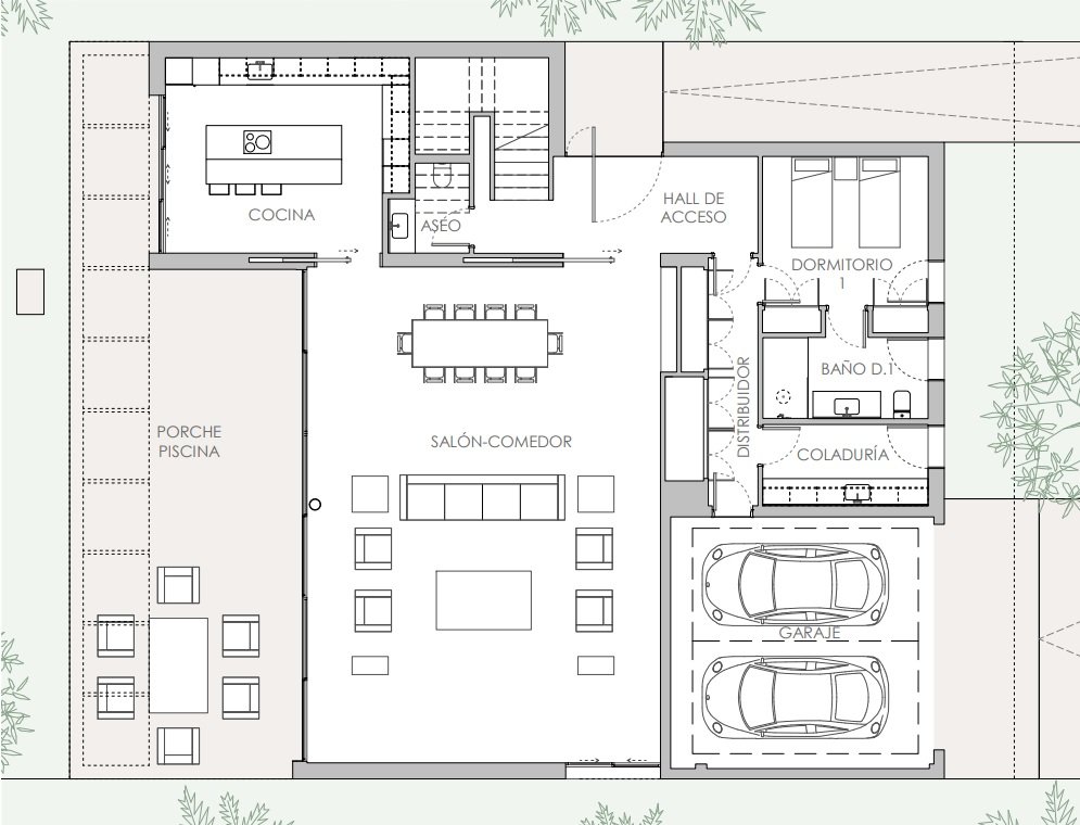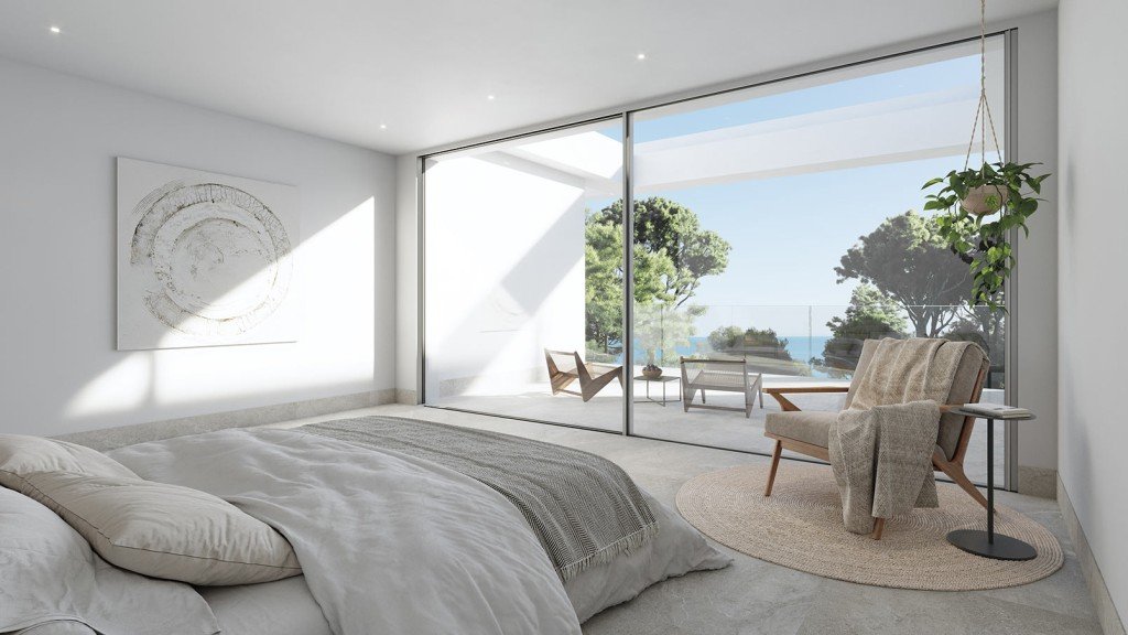 Die Villa wird sich über zwei Etagen erstrecken. Im Erdgeschoss befindet sich eine moderne Küche, die mit Gaggenau-Geräten ausgestattet ist, sowie ein offener Grundriss, in dem sich ein Wohnzimmer mit Essbereich befindet, das Zugang zur Terrasse und zum Pool hat. Auf dieser Ebene befinden sich auch eine Waschküche, eine Gästetoilette und ein Doppelschlafzimmer mit eigenem Bad.