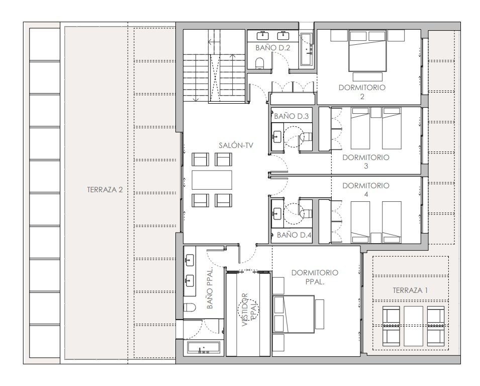 Im ersten Stock befinden sich vier weitere Schlafzimmer - alle mit eigenem Bad und Einbauschränken, darunter das Hauptschlafzimmer mit Ankleidezimmer und Terrasse. Außerdem gibt es einen weiteren Wohnbereich mit Zugang zu einer riesigen zweiten Terrasse, die viel Platz zum Entspannen und zur Unterhaltung von Gästen bietet.