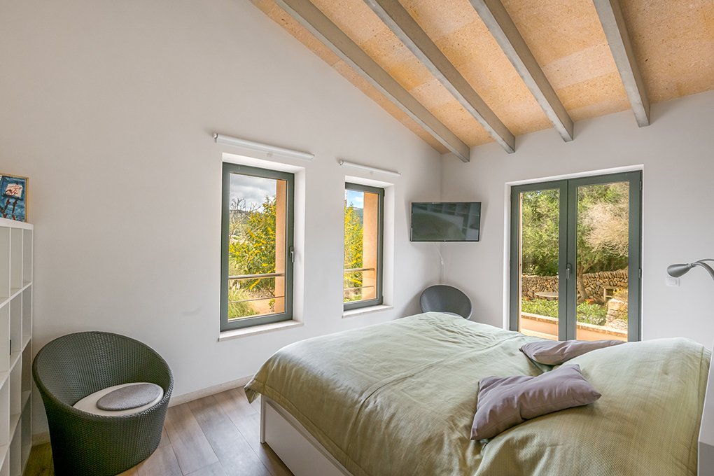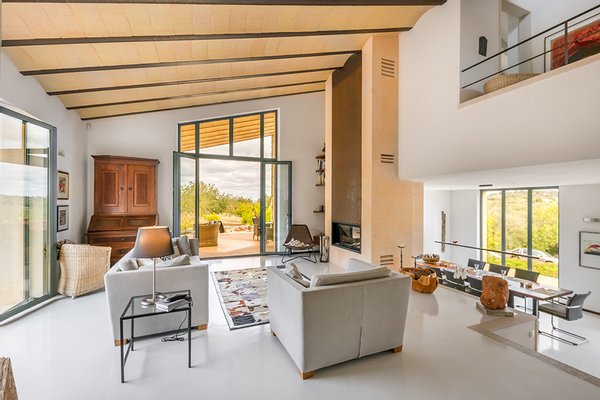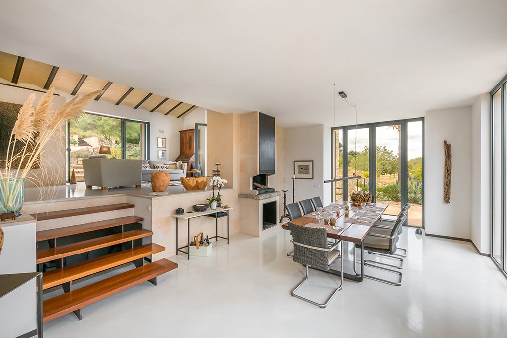 Im Erdgeschoss der Finca befinden sich ein großes Esszimmer mit einem gemütlichen Kamin und eine moderne Einbauküche mit Zugang zum Außenbereich.