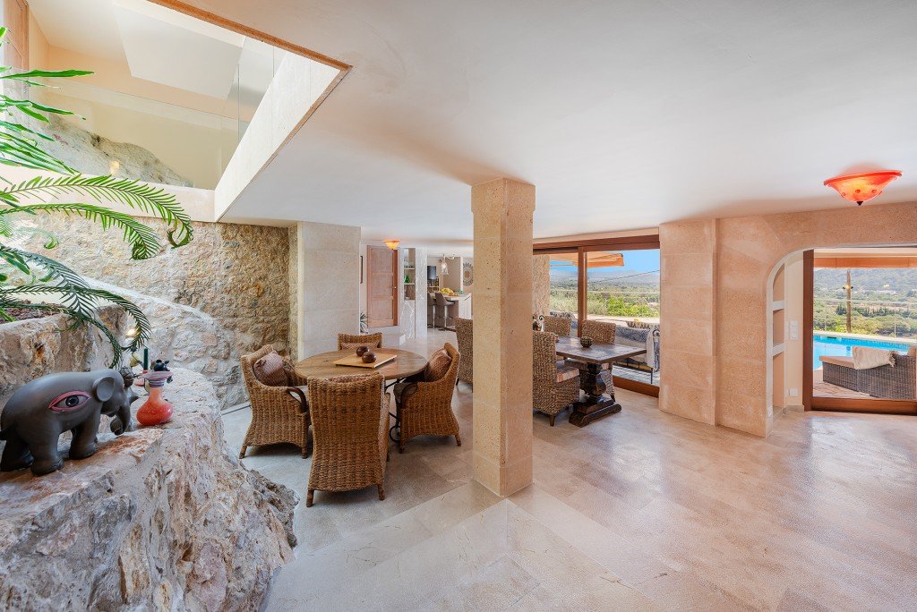 Diese Villa wurde sorgfältig gestaltet und bietet Annehmlichkeiten wie Fußbodenheizung und einen beheizten Pool für Ihren Komfort. Die Verwendung von Santanyí-Stein in den Wänden spiegelt das Bekenntnis zur Erhaltung der natürlichen Landschaft wider.