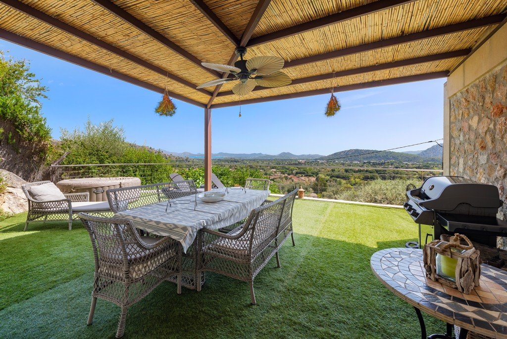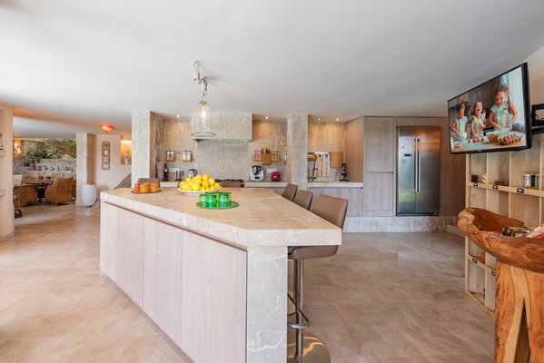 Wenn Sie die zweistöckige Villa betreten, finden Sie eine Dachterrasse mit charmanten Steintürmen, die Stauraum bieten. Einer dieser Türme verfügt sogar über eine Treppe, die ins Innere der Villa führt. Die Terrasse bietet auch eine Außenküche und einen schattigen Essbereich, ideal, um Mahlzeiten zu genießen und dabei den beeindruckenden Ausblick zu bewundern.