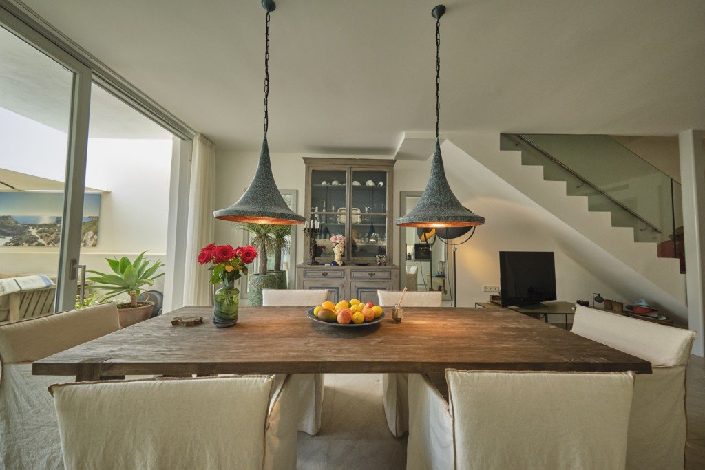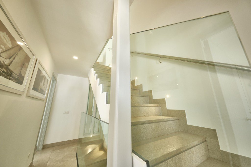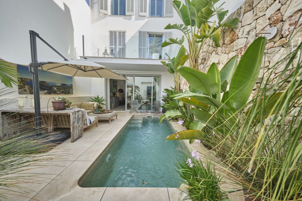 Das dreistöckige Haus ist ca. 172m2 groß und im Erdgeschoss befindet sich ein heller, offener Bereich, der eine Einbauküche, ein Wohn-/Esszimmer mit Kamin, ein Gäste-WC und eine Waschküche beinhaltet. Glastüren gewähren direkten Zugang zum Hofgarten, in dem sich ein pflegeleichter Garten mit tropischen Beetpflanzen, eine Terrasse und ein luxuriöses Tauchbecken befinden.
