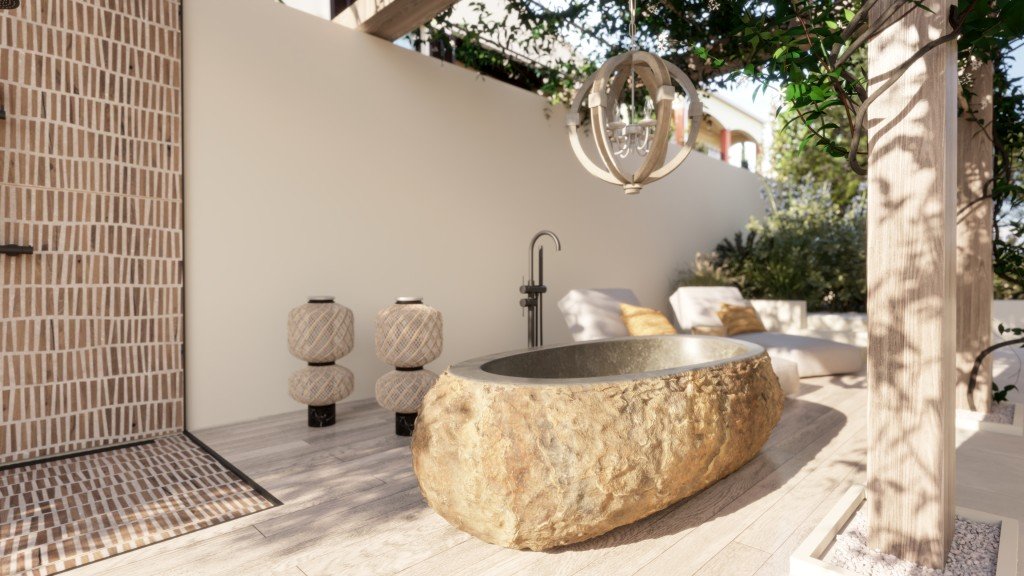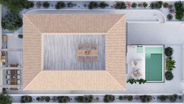 Der einladende Außenbereich umfasst einen Pool, überdachte Essbereiche, Lounging-Bereiche und eine Außenküche mit Grill, Pizzaofen und einem Essbereich.