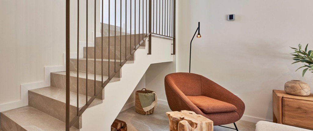Im Erdgeschoss gehen die Küche und das Wohnzimmer nahtlos ineinander über und führen auf eine geräumige Terrasse, wo sich auch eine kleine Garderobe befindet. Die Wohnbereiche sind dank der großen Terrassentüren, die sich zu den großzügigen Terrassen öffnen, in natürliches Licht getaucht. Die gut ausgestattete Küche ist sowohl unabhängig als auch offen.