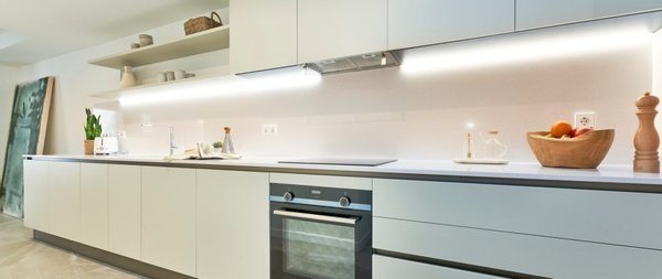 Die Küche ist komplett mit hellen Möbeln eingerichtet. Sie ist mit hochwertigen Geräten der renommierten Marke Siemens ausgestattet, darunter ein Induktionskochfeld, ein Backofen und ein Dunstabzug.