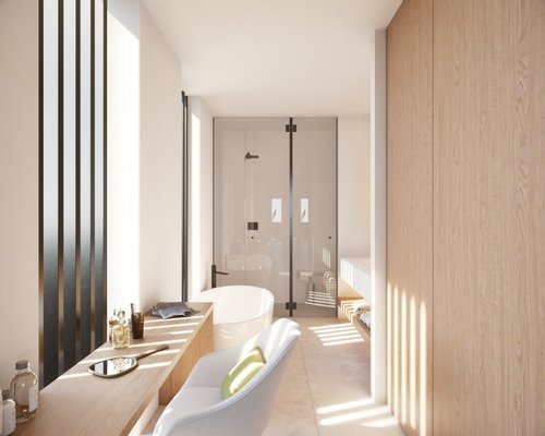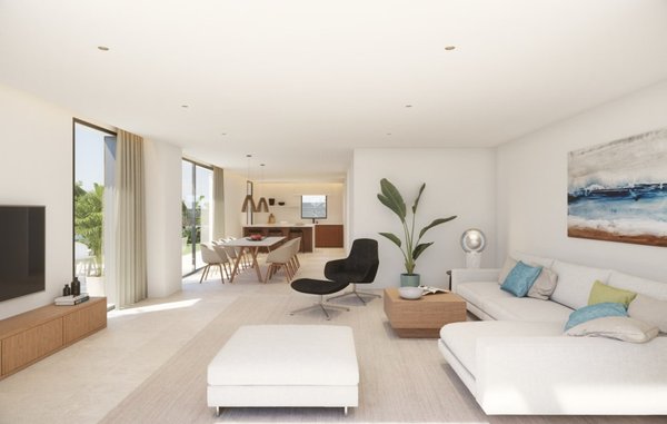 Im ersten Stock befinden sich drei Schlafzimmer, zwei Badezimmer und ein Hauswirtschaftsraum. Dazu gehört ein wunderschönes Schlafzimmer mit eigenem Bad, Ankleideraum und privater Terrasse. Die zweite Etage bietet ein großes Hauptschlafzimmer mit Ankleide, ein eigenes Bad mit optionaler Badewanne und eine Terrasse. Zusätzlich befindet sich auf dieser Etage ein weiteres Schlafzimmer mit eigenem Bad. Abschließend gibt es eine großzügige Dachterrasse mit viel Platz zum Entspannen sowie einer optionalen Pool- und Außenküche mit Essbereich.