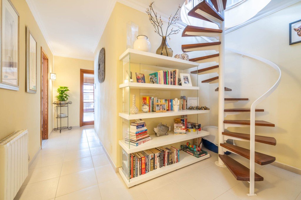 Eine Wendeltreppe führt in die obere Etage, die derzeit als zusätzliches Wohnzimmer genutzt wird, aber auch in eine luxuriöse Master-Suite umgewandelt werden könnte.