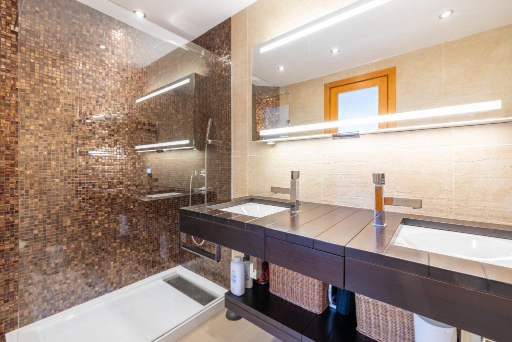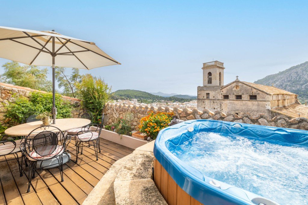 Ein fantastisches Highlight ist, dass das Haus über drei Terrassen verfügt, von denen eine als Wäscheterrasse, eine als Sundowner-Terrasse und die andere mit einem Jacuzzi und viel Platz zum Entspannen ausgestattet ist. Von den Terrassen aus hat man einen atemberaubenden Panoramablick auf die nahe gelegene Kirche, den Puig de Maria, das Tramuntana-Gebirge, die malerische Landschaft und das Meer in der Ferne.