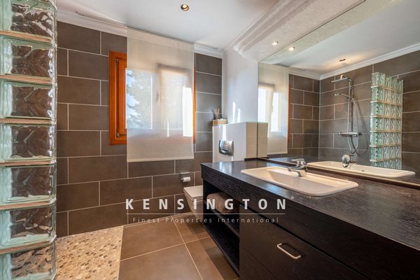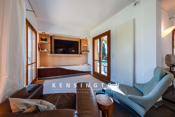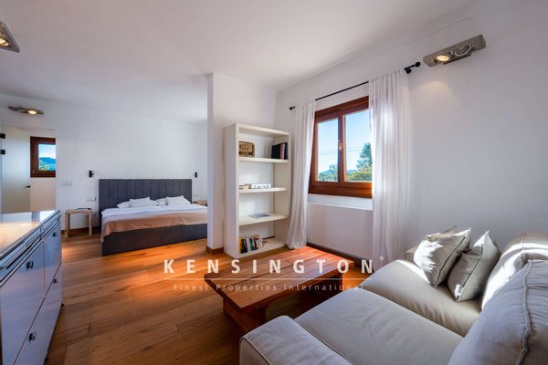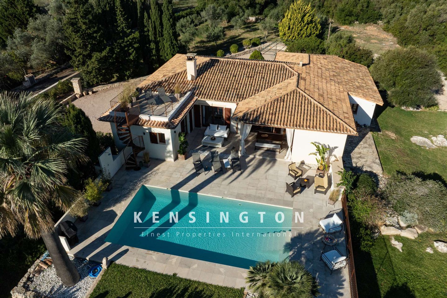 Vom Wohnraum aus betritt man die teils überdachte Terrasse, vor der sich der 51 m2 grosse Pool nach Osten erstreckt. Eine Wendeltreppe führt hinauf zur Sonnenterrasse, die einen umwerfenden Blick ins Grüne (und an freien Tagen sogar bis hin zum Meer und Menorca) freigibt.