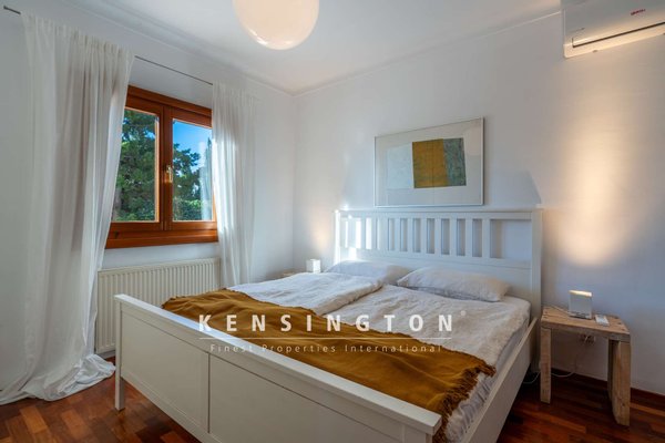 Man betritt das Haus in das repräsentative Entrée. Wendet man sich nach Links, erreicht man das erste Schlafzimmer, welches neben einem begehbaren Kleiderschrank zudem über ein grosses Bad en suite mit ebenerdiger Dusche und eingelassener Badewanne verfügt.