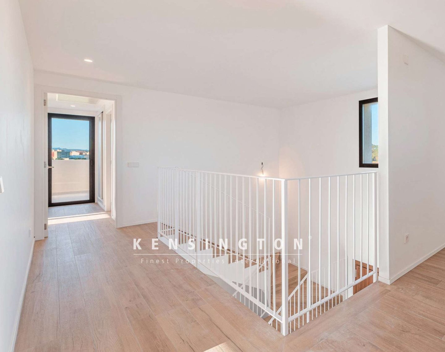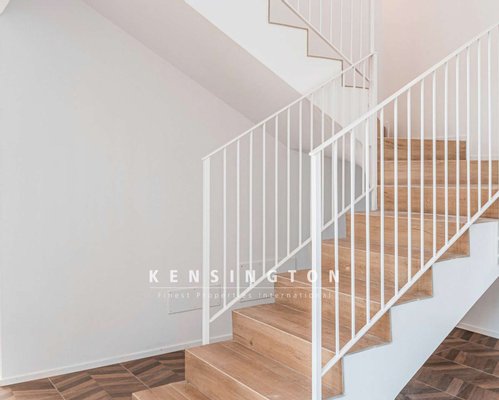 Im ersten Stock liegen drei Schlafzimmer, die sich 2 Badezimmer und zwei große Terrassen teilen.