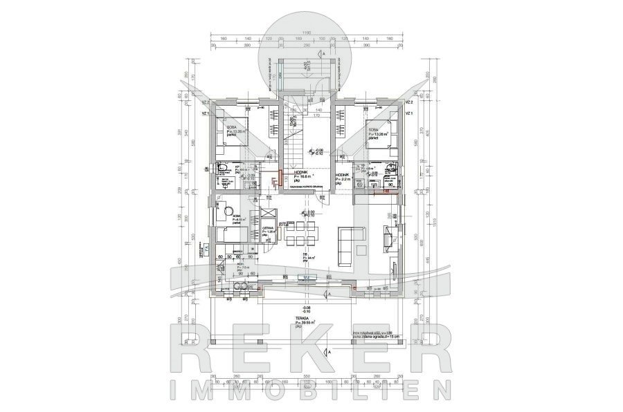 In der ersten Etage befinden sich drei Schlafzimmern, ein Wohnzimmer, eine Küche, ein Esszimmer, zwei Badezimmer, ein Flur, ein Abstellraum und eine weitere Terrasse von 39,55 m².