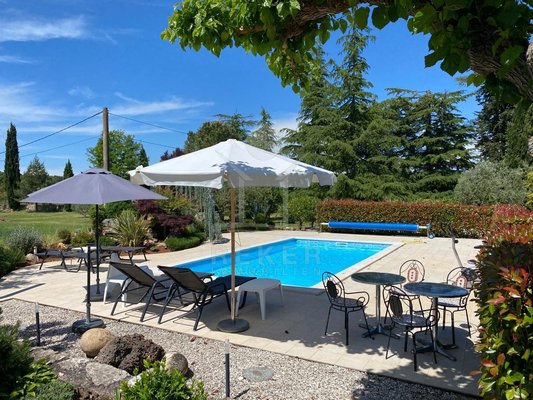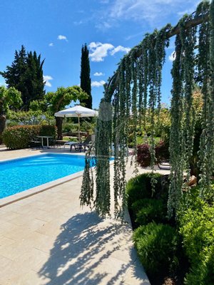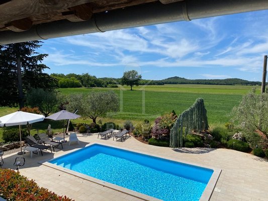 Genießen Sie direkt an der Villa einen mediterranen Garten mit Oliven-, Zitronen- und Feigenbäumen sowie mediterranen Kräutern, welche den ca. 32 m² großen und sonnigen Pool harmonisch umfassen. Auch an eine gepflasterte Liegewiese für mehrere Liegestühle zum Sonnenbaden ist gedacht. Eine großzügige und teils überdachte Terrasse lädt zum Verweilen ein. 2 Etagen mit 5 Zimmern & Bädern. Erbaut im landestypischem Stil mit Bruchstein und schönen Fensterläden.