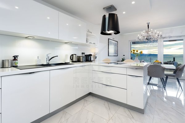 Ein exklusiver Rückzugsort, nur 450 m vom Meer entfernt. In der nahen Umgebung von Kostrena umgeben von idyllischer und erholsamer Landschaft, befindet sich diese moderne und luxuriöse Wohnung. Genießen Sie einen malerischen Ausblick auf das Meer.