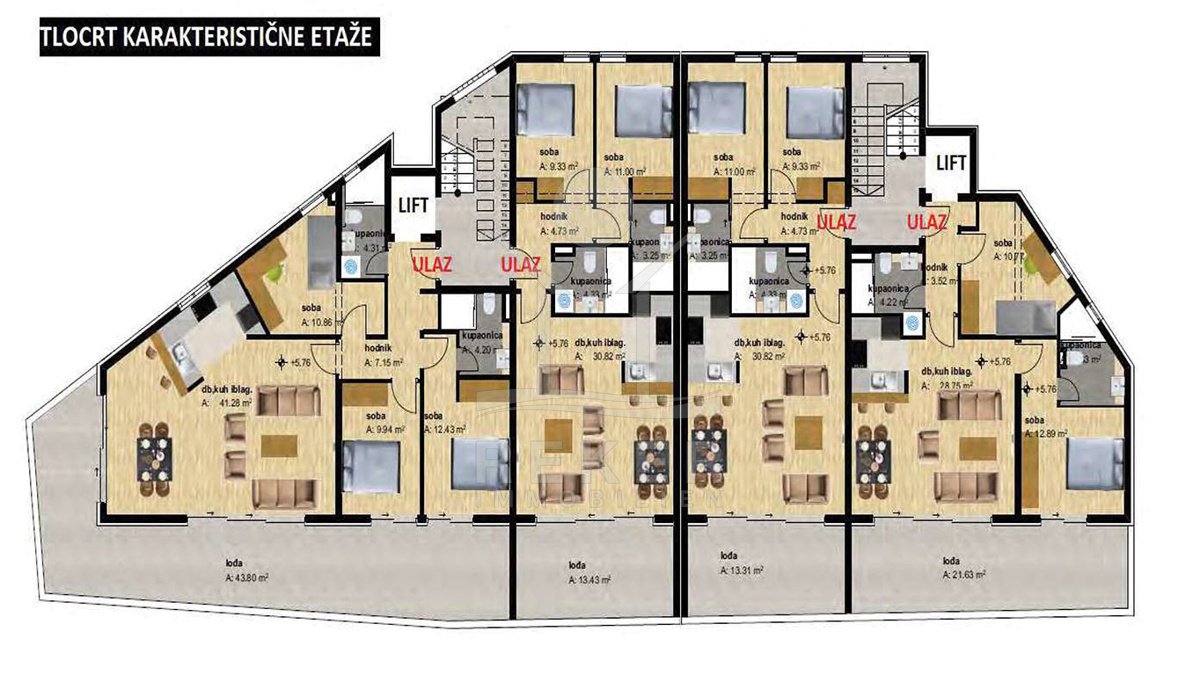 Dieses beeindruckende Wohnkomplex bietet sechzehn Wohnungen mit jeweils zwei oder drei Schlafzimmern und Wohnflächen zwischen 73 m² und 162 m².