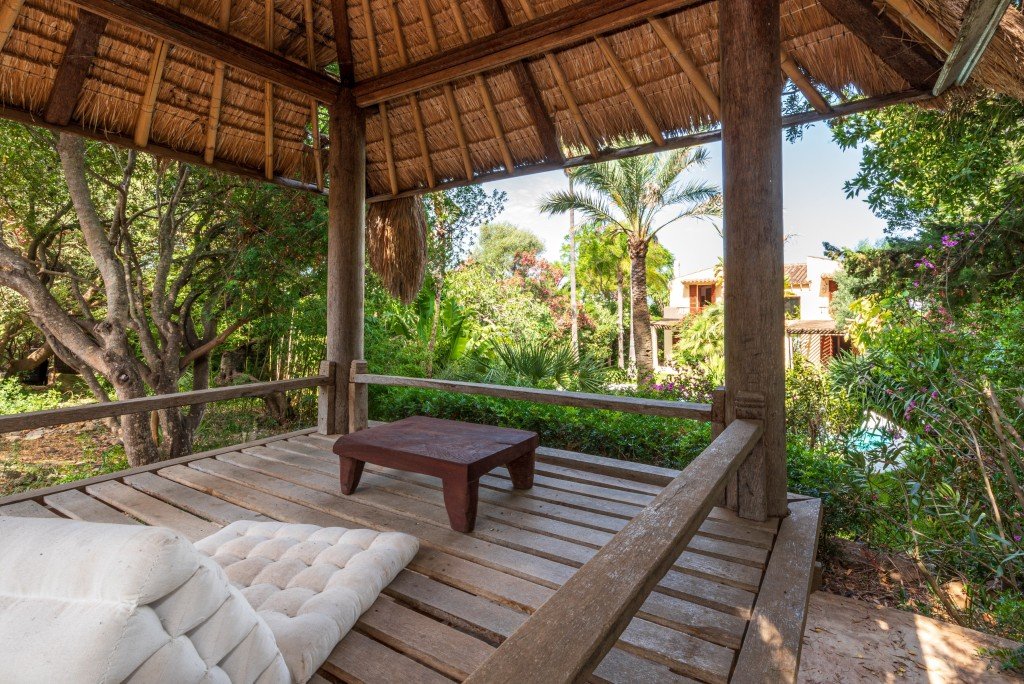 Das Obergeschoss ist über eine Treppe im mexikanischen Pueblo-Stil zu erreichen und umfasst eine Galerie und zwei schöne Schlafzimmer mit schrägen Balkendecken, Einbauschränken, privaten Badezimmern und erhöhten Terrassen mit Blick auf den tropischen Garten, den Pool, die balinesische Hütte und die Berge. Eine weitere Terrasse bietet einen atemberaubenden Blick auf die Bucht von Pollensa und ihre Sonnenuntergänge.