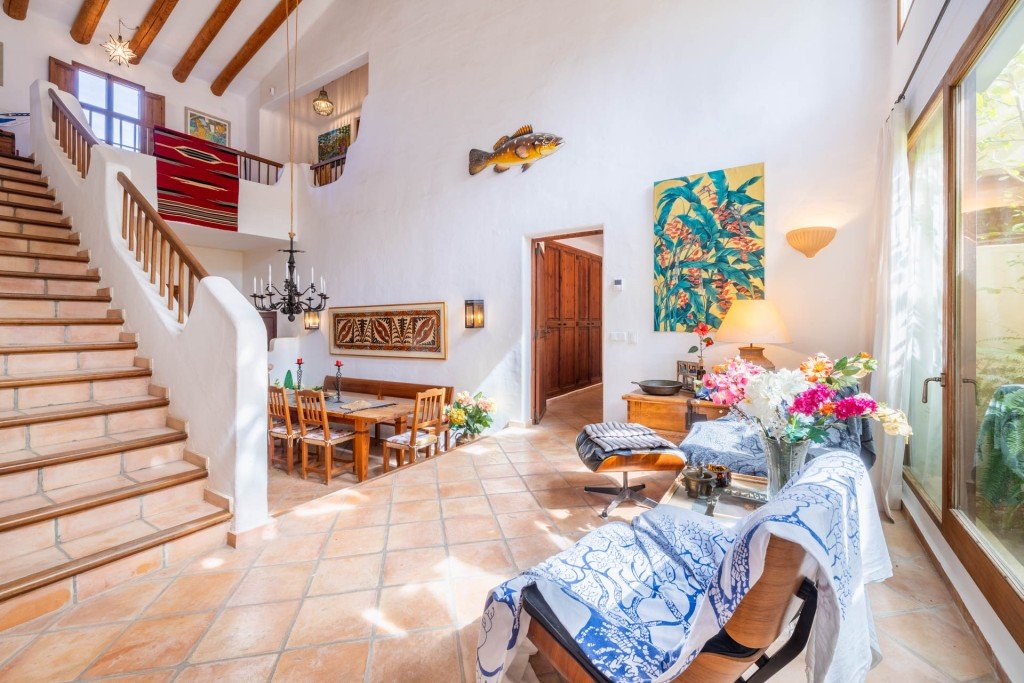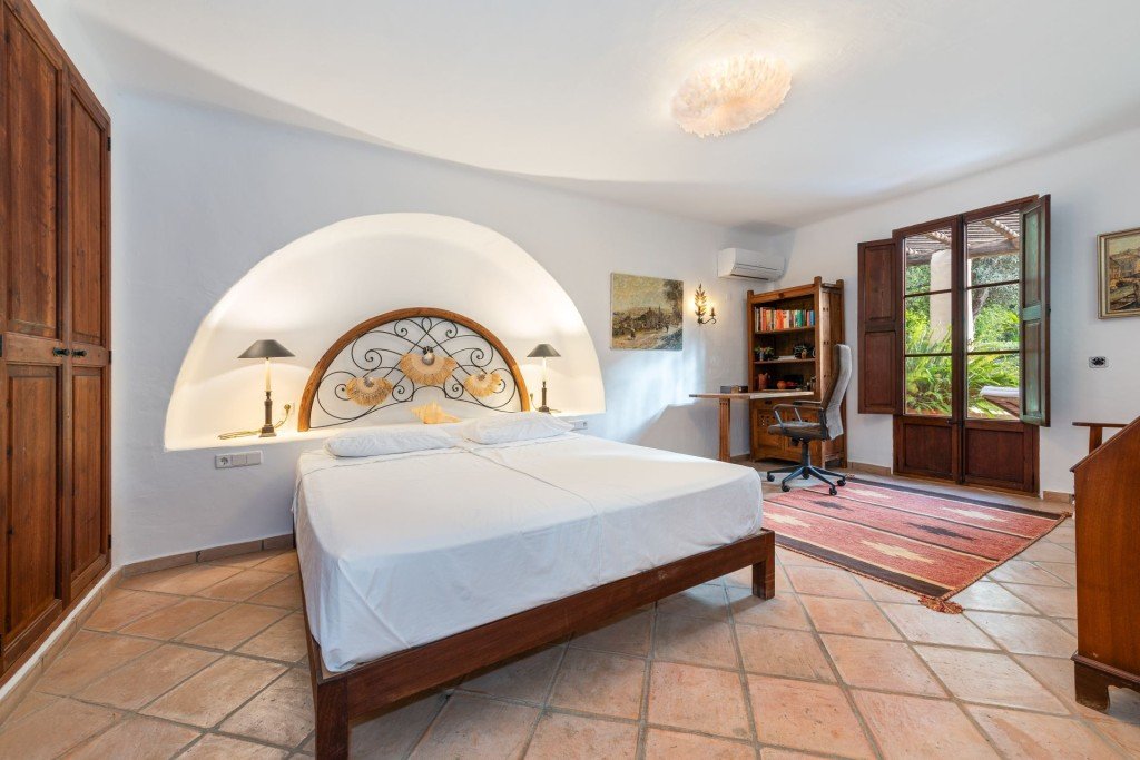 Die Villa erstreckt sich über zwei geräumige Etagen und verfügt über hochwertige natürliche Materialien wie antike Holztüren, handgefertigte Terrakottafliesen, Wacholder- und Holzbalken sowie zwei charmante Kamine. Der beeindruckende Eingangsbereich öffnet sich zu einem hellen Wohn-Esszimmer mit hohen Decken und großen Fenstern. Ein erhöhter Wohnbereich bietet Blick auf einen verglasten Innenhof mit Springbrunnen, während ein elegantes Wohnzimmer im maurischen Stil durch einen breiten Bogen verbunden ist. Die halboffene mallorquinische Küche verfügt über handgefertigte Holzschränke und führt zu einem Hauswirtschaftsraum mit Speisekammer und Zugang zum Garten. Im Erdgeschoss befinden sich außerdem ein großes Doppelzimmer mit Zugang zur Terrasse und einem angrenzenden Badezimmer sowie eine Gästetoilette.