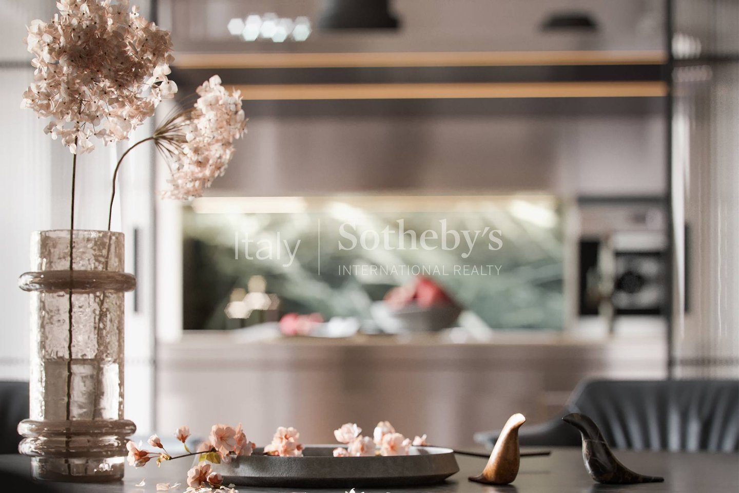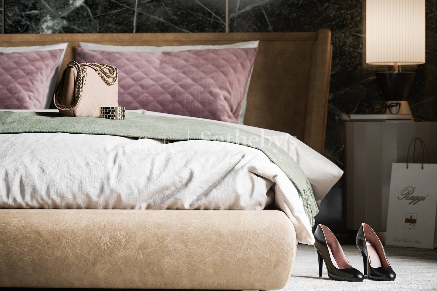 Die Wohnung "Raffaello", die sich im zweiten Stock im Treppenhaus C befindet, besteht aus einer großen Eingangshalle, die zum Wohnbereich mit einer außergewöhnlichen Doppelbelichtung führt; Der Hauptraum des Wohnzimmers mit offener Küche liegt zwischen den beiden Innenhöfen, dem monumentalen Eingang und dem als Garten angelegten, mit fünf Fenstern auf jeder Seite für eine spektakuläre Helligkeit.