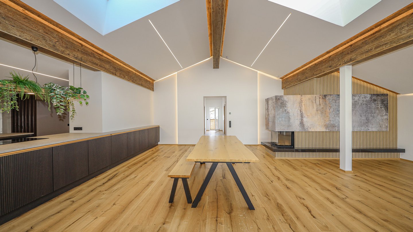 Weiters gelangt man in den über 60 m² großen Wohn-Essbereich mit Kamin und offener Küche mit Bar.