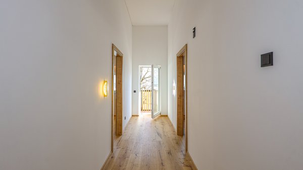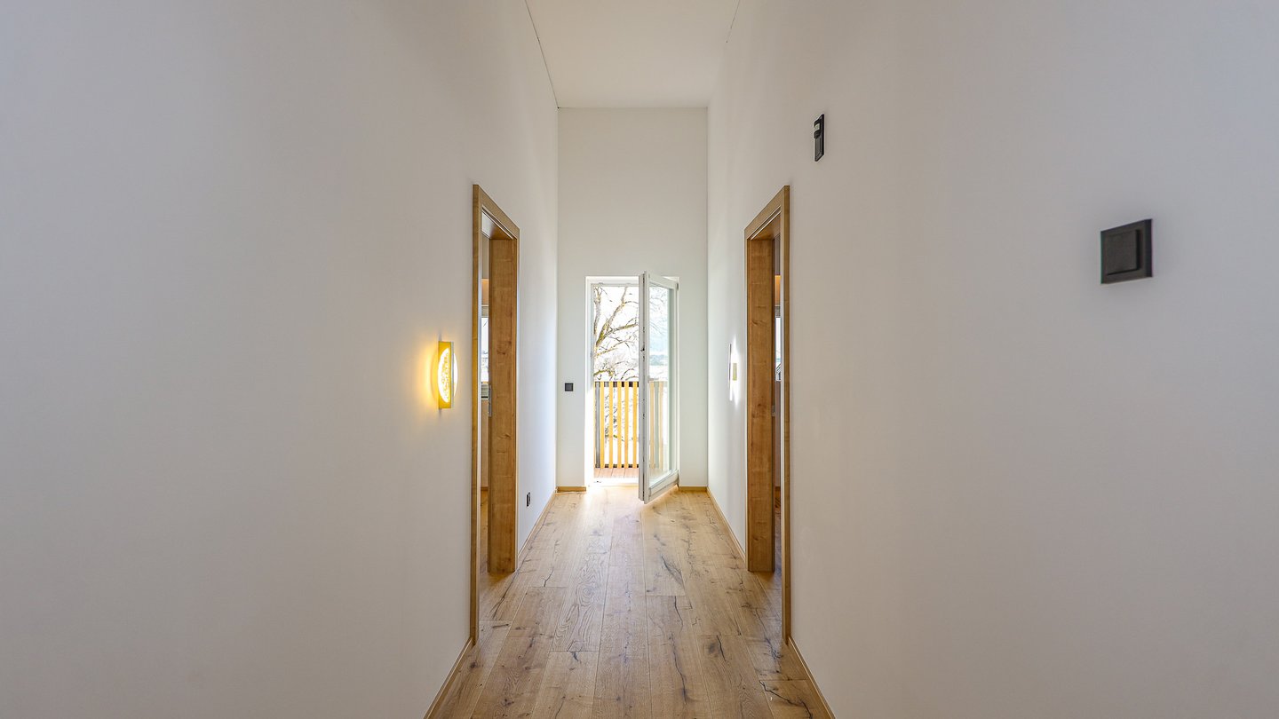 Man betritt das Penthouse und gelangt in einen geräumigen Vorraum mit Garderobe und Gäste-Toilette.