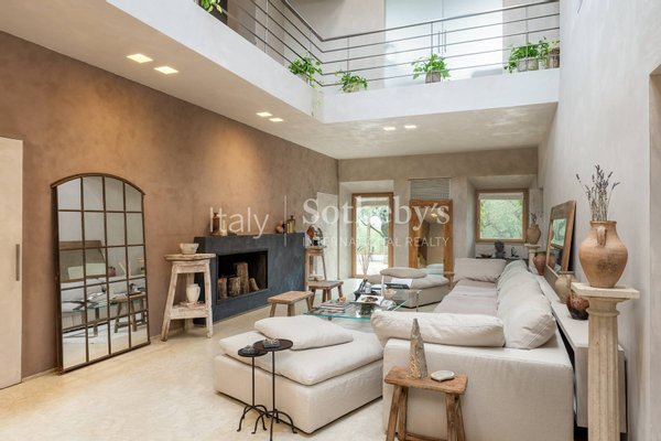 The villa consists of a main house with 5 bedrooms and a fully equipped 2-bedroom apartment that can be joined or separated for a total of 7 bedrooms and 6 full bathrooms. The main house features a spacious living room, a cinema room, a billiards table room, and indoor and outdoor dining areas. The 2-bedroom apartment offers a kitchenette, a living area, 2 queen-size bedrooms, and 1 and a half bathrooms. The interiors are modern and contemporary with typical farmhouse details such as exposed beam ceilings and natural stone. The soft cream-colored walls and designer furniture in the living rooms are beautifully arranged for comfort and relaxation. Each room is carefully designed with quality fabrics in a palette of neutral and soothing colors. Equipped with air conditioning, insulated windows, and comfortable beds, each room is unique in its own way.