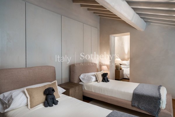 The dining room is designed for large gatherings, with a long reclaimed wood table surrounded by large windows where you can appreciate the beauty of the Florentine countryside. The updated contemporary kitchens feature modern appliances such as a dishwasher, Nespresso coffee machine, fryer, and oven.