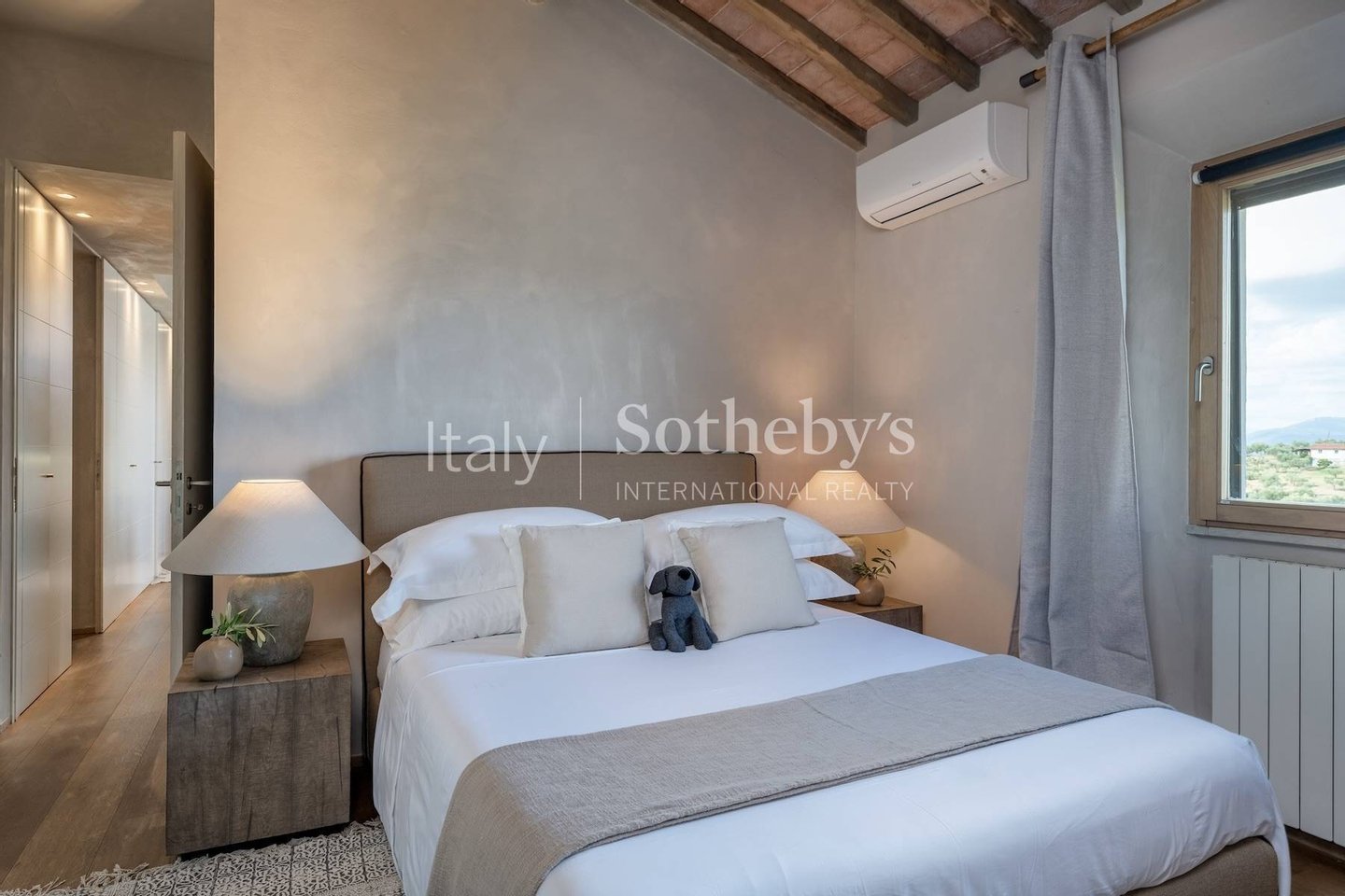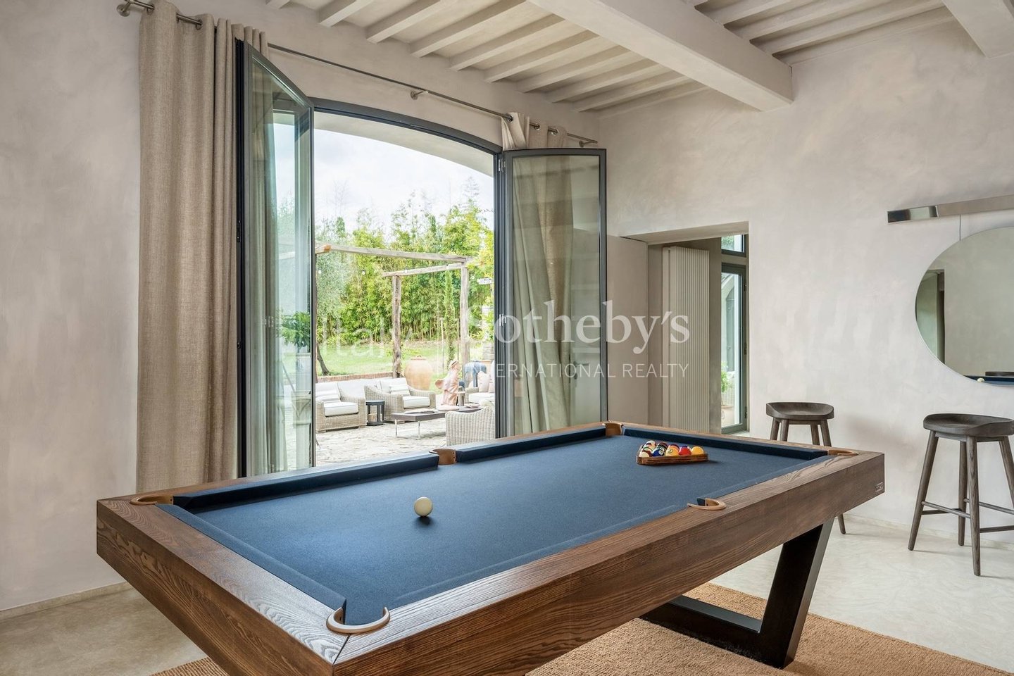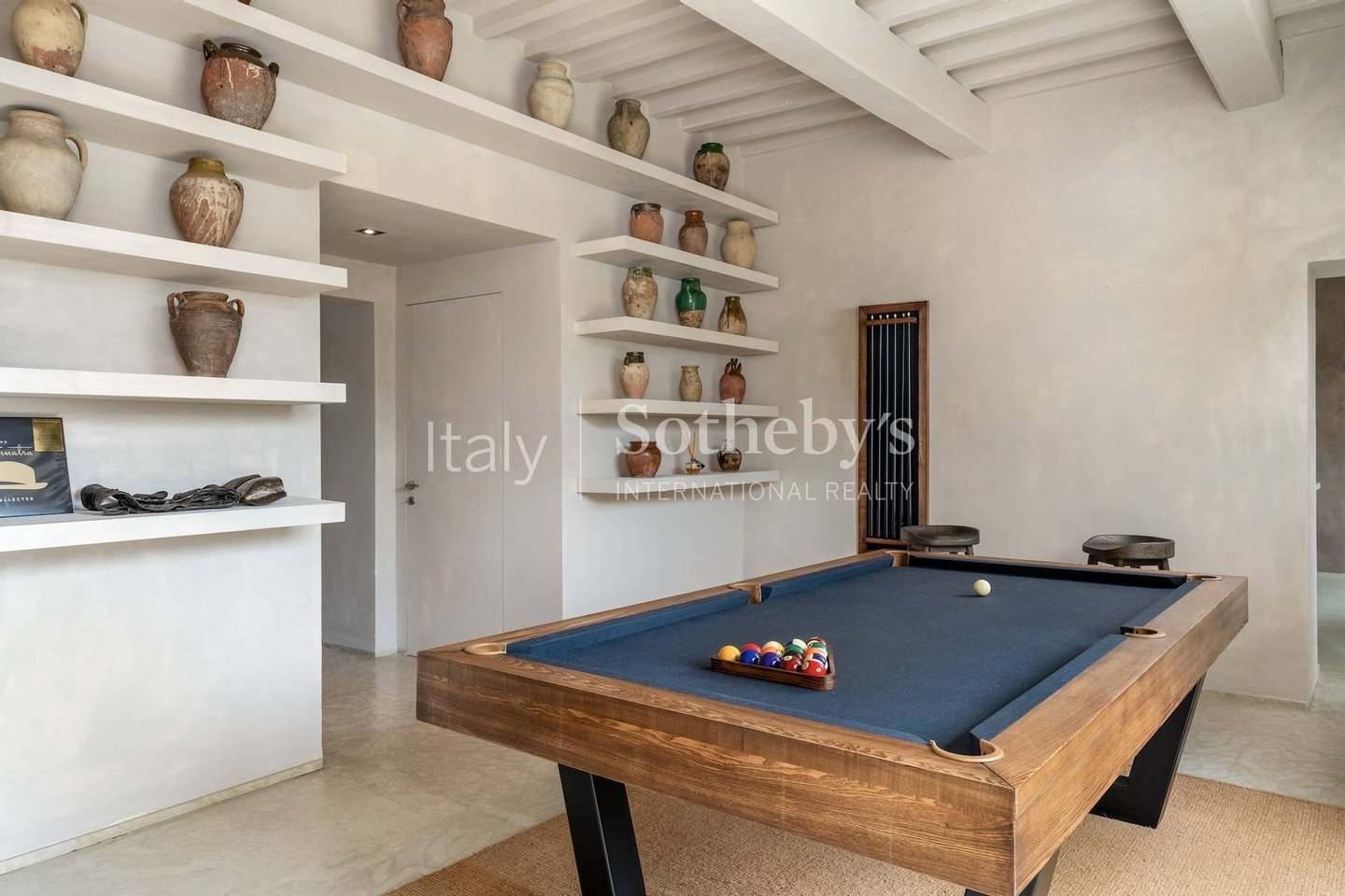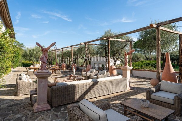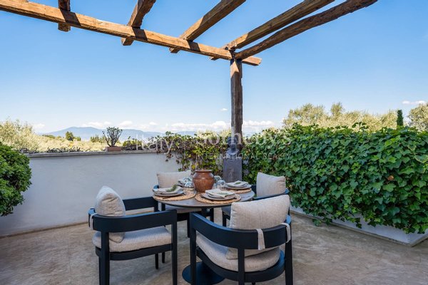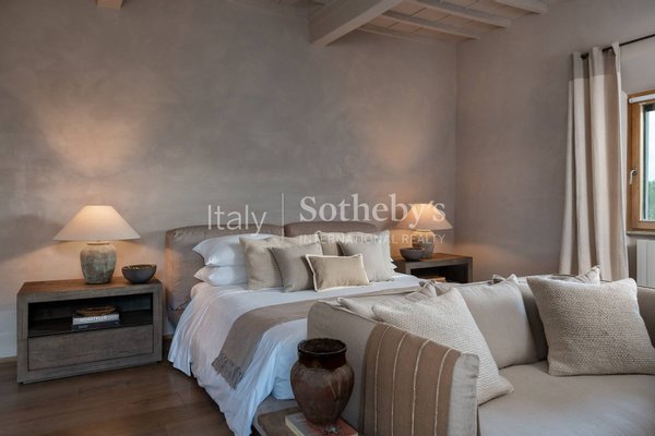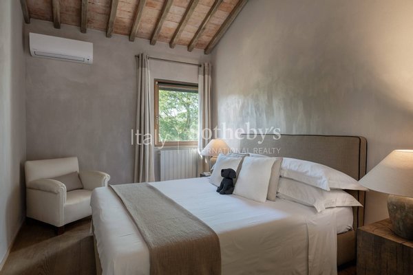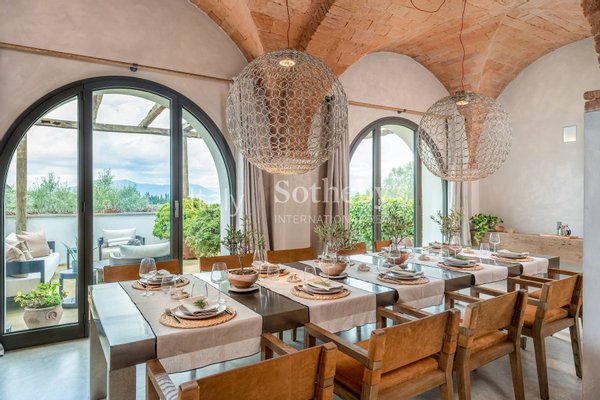 The villa consists of a main house with 5 bedrooms and a fully equipped 2-bedroom apartment that can be joined or separated for a total of 7 bedrooms and 6 full bathrooms. The main house features a spacious living room, a cinema room, a billiards table room, and indoor and outdoor dining areas. The 2-bedroom apartment offers a kitchenette, a living area, 2 queen-size bedrooms, and 1 and a half bathrooms. The interiors are modern and contemporary with typical farmhouse details such as exposed beam ceilings and natural stone. The soft cream-colored walls and designer furniture in the living rooms are beautifully arranged for comfort and relaxation. Each room is carefully designed with quality fabrics in a palette of neutral and soothing colors. Equipped with air conditioning, insulated windows, and comfortable beds, each room is unique in its own way.