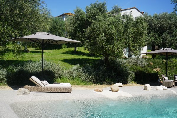 The pool area is surrounded by olive trees creating a charming ambiance.