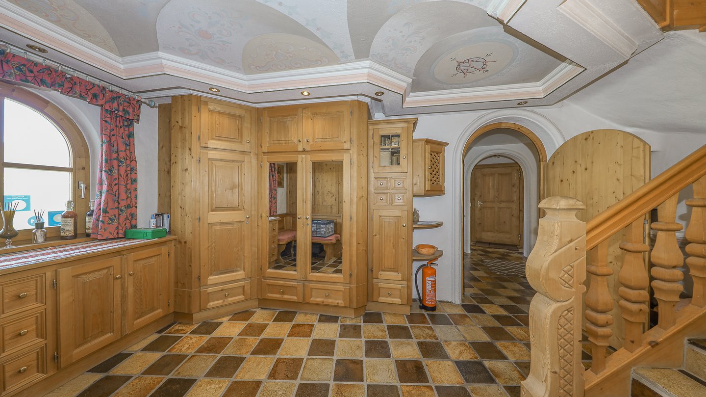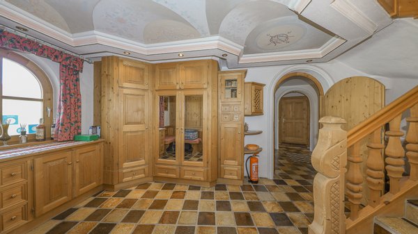 Man betritt das Haus und gelangt in eine große Diele mit Garderobe, wo die Treppe ins Ober- und Untergeschoss führt.
