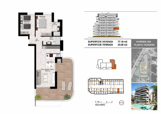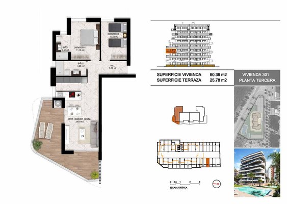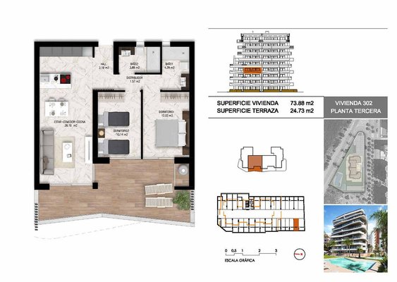 Das moderne Gebäude wird aus 32 Wohnungen mit je 2 Schlafzimmern und 2 Bädern und mit großzügigen Terrassen, Tiefgaragenplatz und privatem geschlossenen Abstellraum bestehen. Es gibt 9 Etagen und auf der obersten Etage liegen die Penthouse-Wohnungen mit Terrasse und privater Dachterrasse. Selbstverständlich wird es auch einen Gemeinschaftspool und sehr schöne Gemeinschaftsanlagen mit Naturrasen geben.