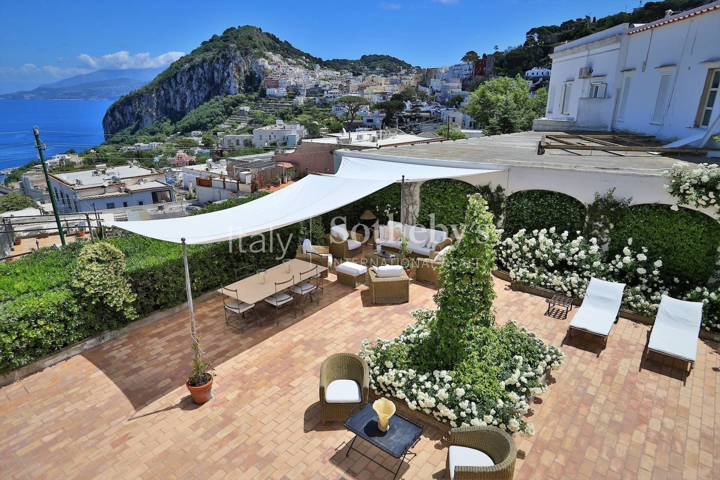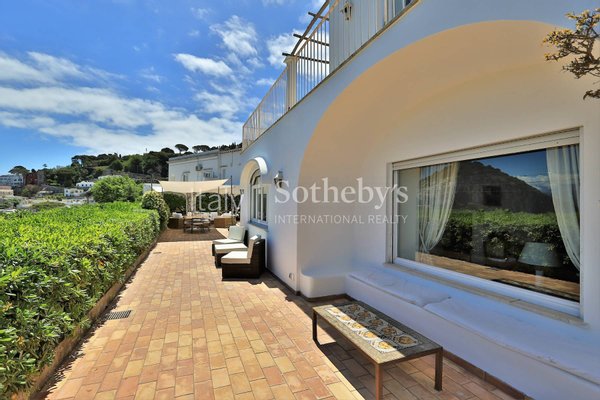 Excellently positioned and equipped with spacious panoramic terraces, it boasts a splendid 360° panorama with views of the center of Capri, the Sorrentine Peninsula, the port, reaching all the way to Mount Vesuvius and part of the Gulf of Naples.