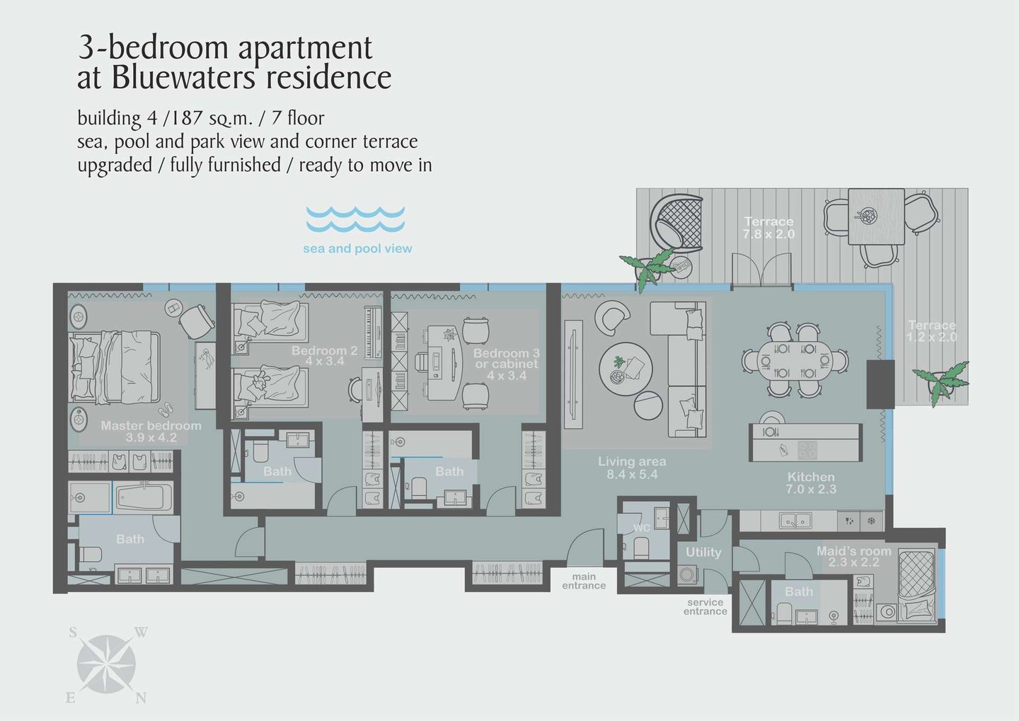 Willkommen in Ihrem neuen Zuhause in den exklusiven Bluewaters Residences! Diese geräumige 4-Zimmer-Wohnung bietet nicht nur genügend Platz für Familien, sondern begeistert auch Kapitalanleger mit hochwertigen Ausstattungsmerkmalen. Neben einem Dienstmädchenzimmer für zusätzlichen Komfort verfügt die Wohnung über eine beeindruckende Eckterrasse, die zum Entspannen und Genießen der atemberaubenden Aussicht einlädt. Erleben Sie Luxus und Komfort in einer einzigartigen Umgebung - Willkommen in Ihrer neuen Traumwohnung in Bluewaters Residences!