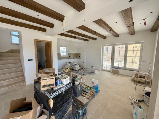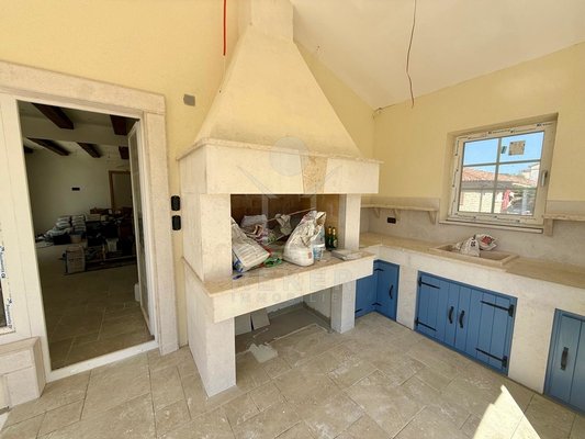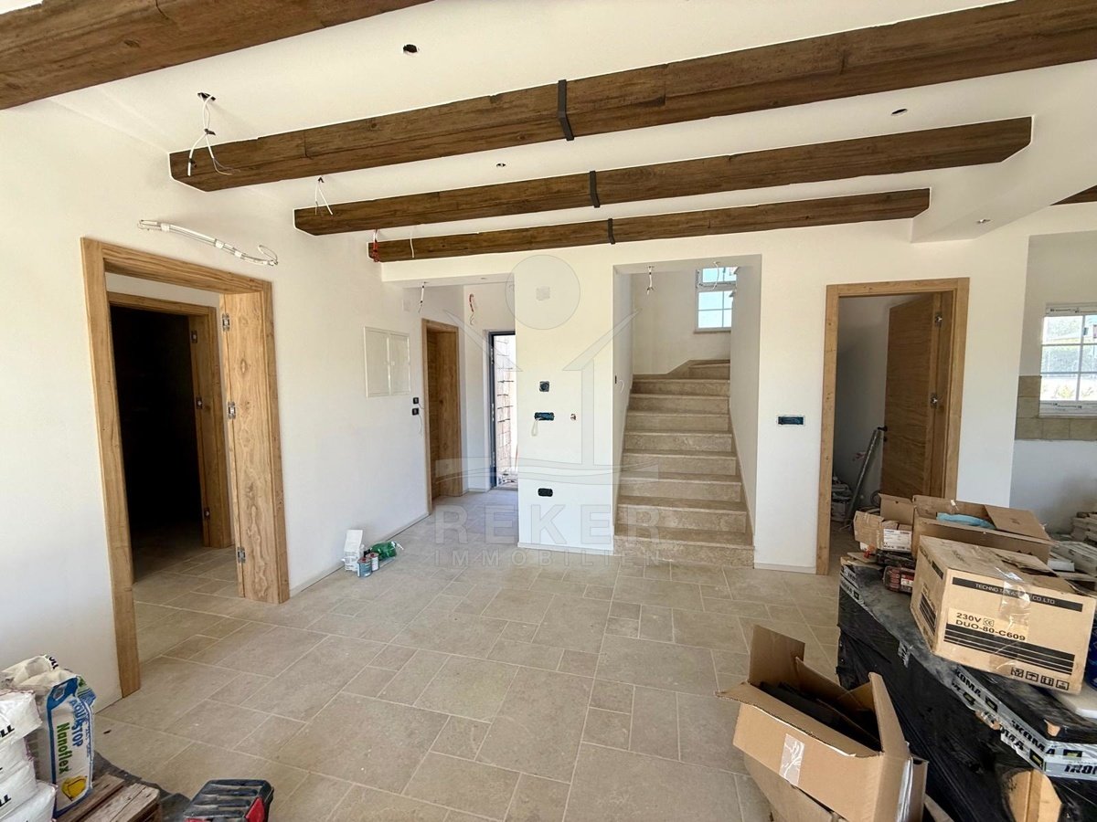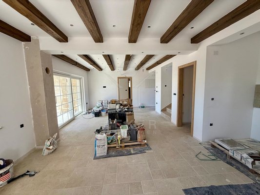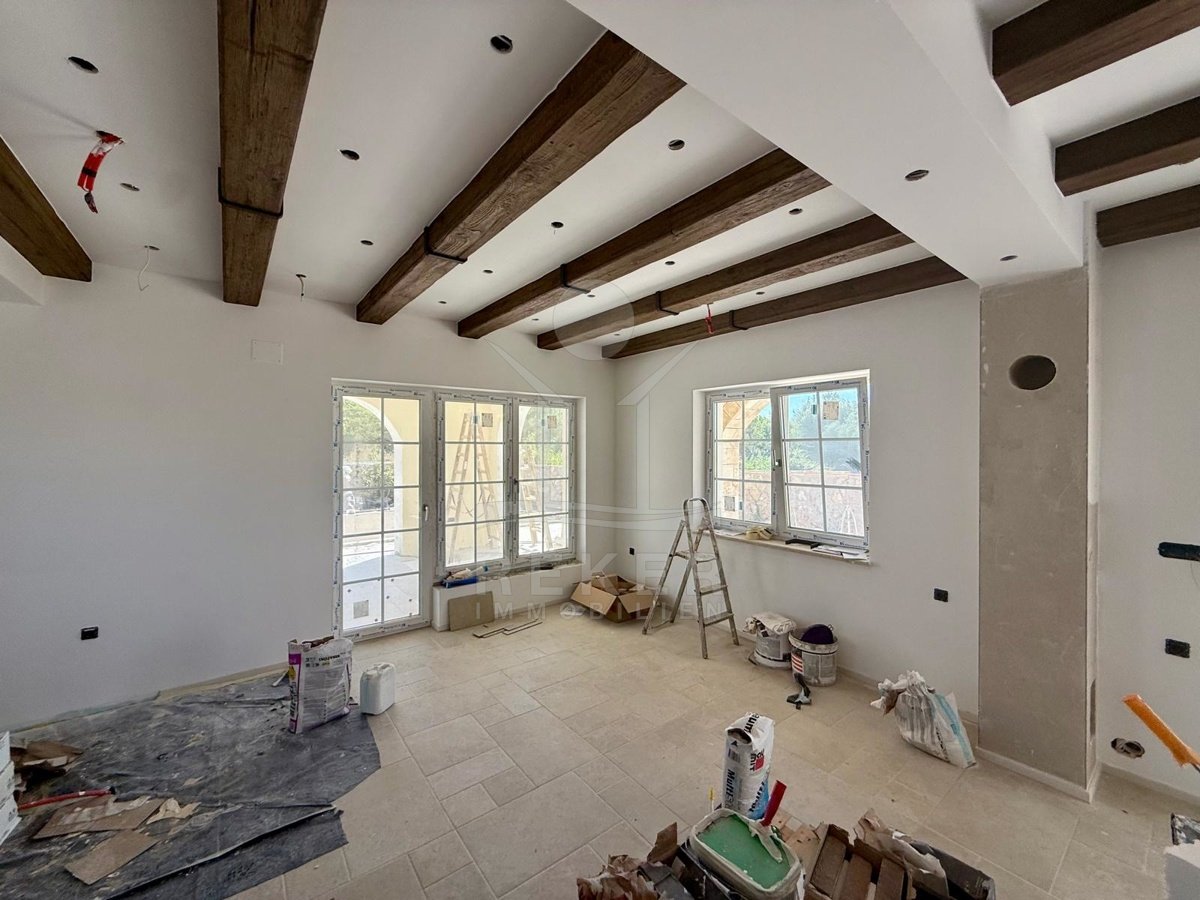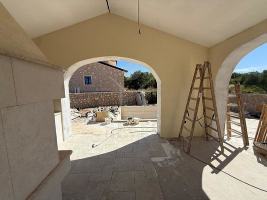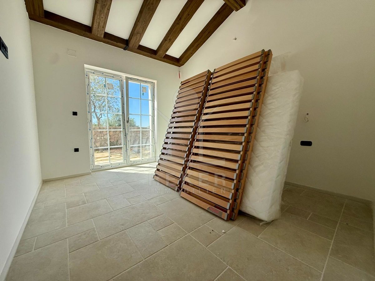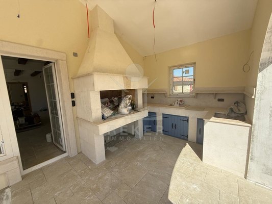 Der Außenbereich spricht für sich: breiter Terrassenbereich entlang der gesamten Hausfront, überdachter Essplatz mit gemauerter Sommerküche. Alles ausgerichtet nach Südost – also morgens Sonne, nachmittags Schatten. Daneben der Pool, eingefasst in Natursteinplatten. Der Garten ist bereits angelegt. Die Bauqualität? Hoch. Modernes Mauerwerk, klassische mediterrane Linien, massive Fensterläden. Alles neu, Baujahr 2025.