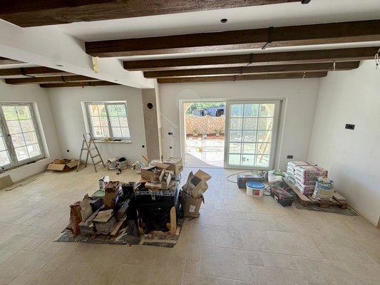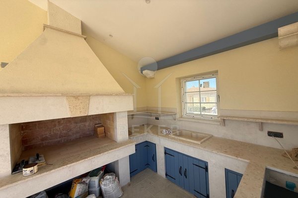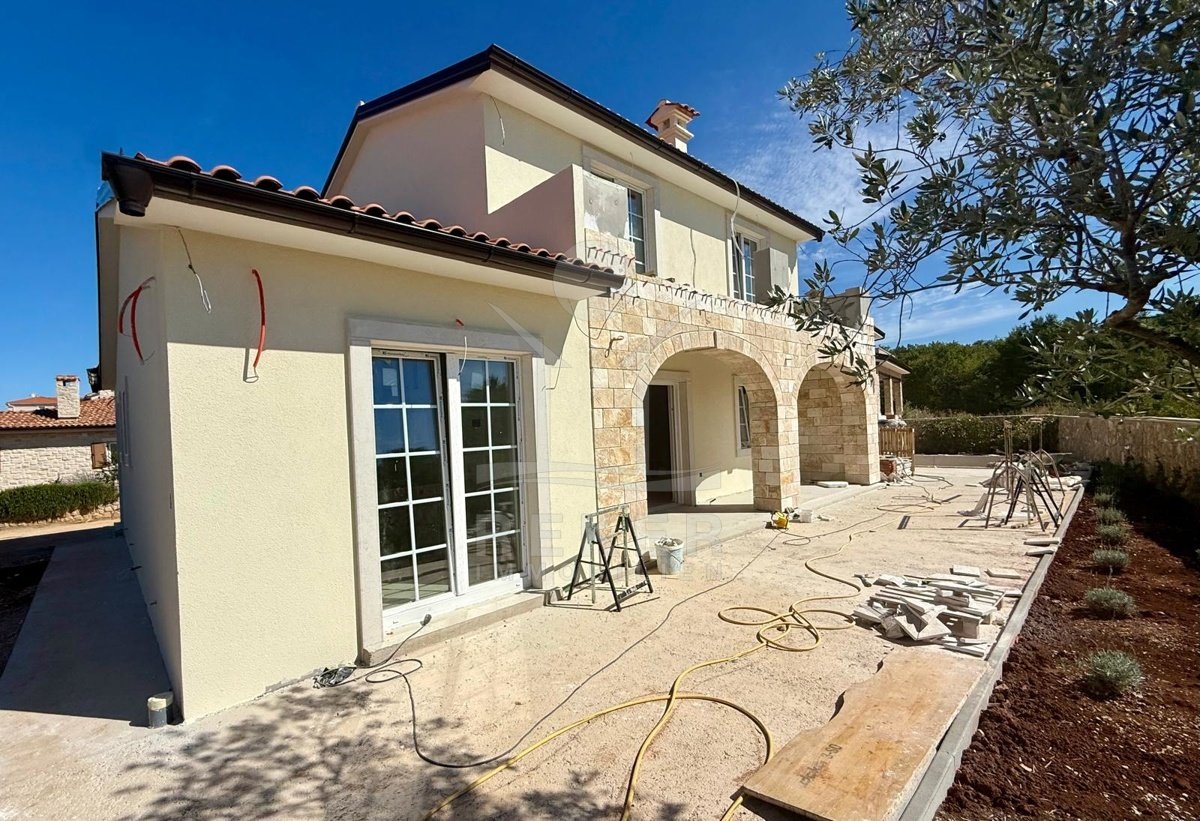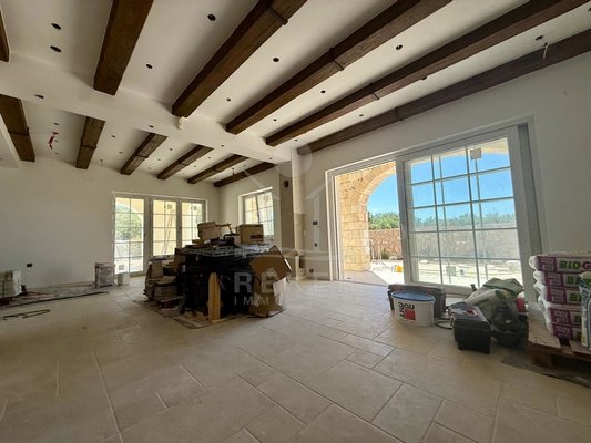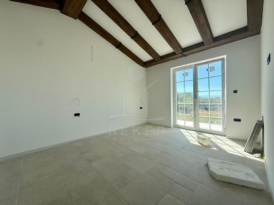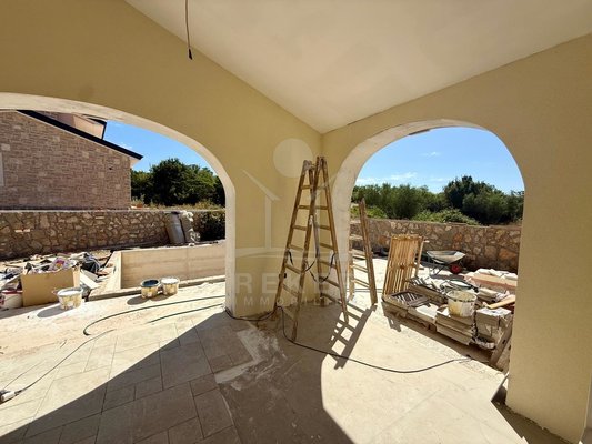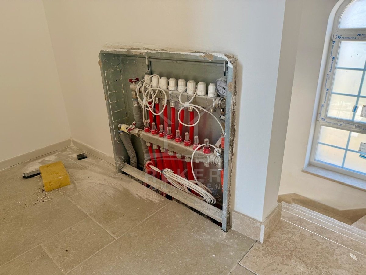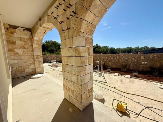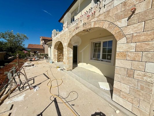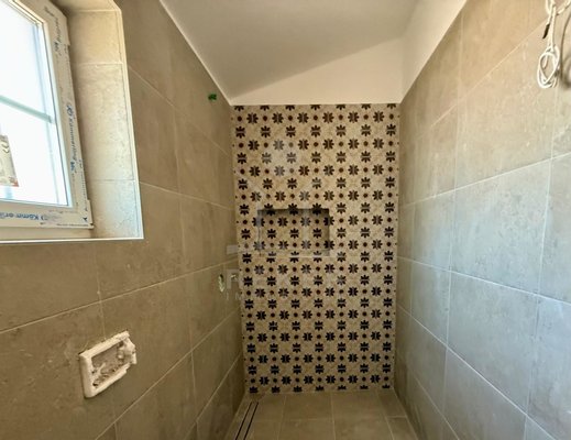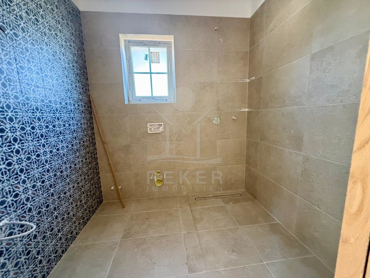 Der Außenbereich spricht für sich: breiter Terrassenbereich entlang der gesamten Hausfront, überdachter Essplatz mit gemauerter Sommerküche. Alles ausgerichtet nach Südost – also morgens Sonne, nachmittags Schatten. Daneben der Pool, eingefasst in Natursteinplatten. Der Garten ist bereits angelegt. Die Bauqualität? Hoch. Modernes Mauerwerk, klassische mediterrane Linien, massive Fensterläden. Alles neu, Baujahr 2025.