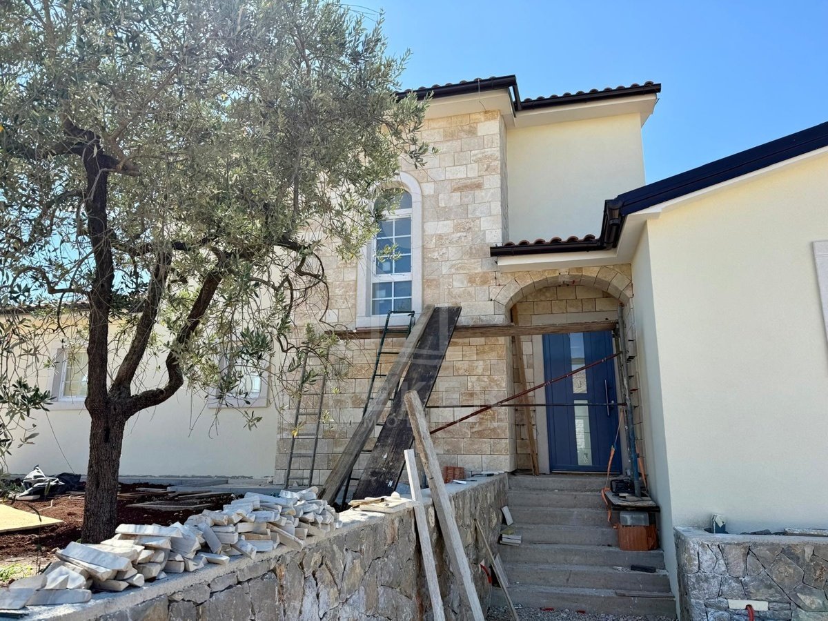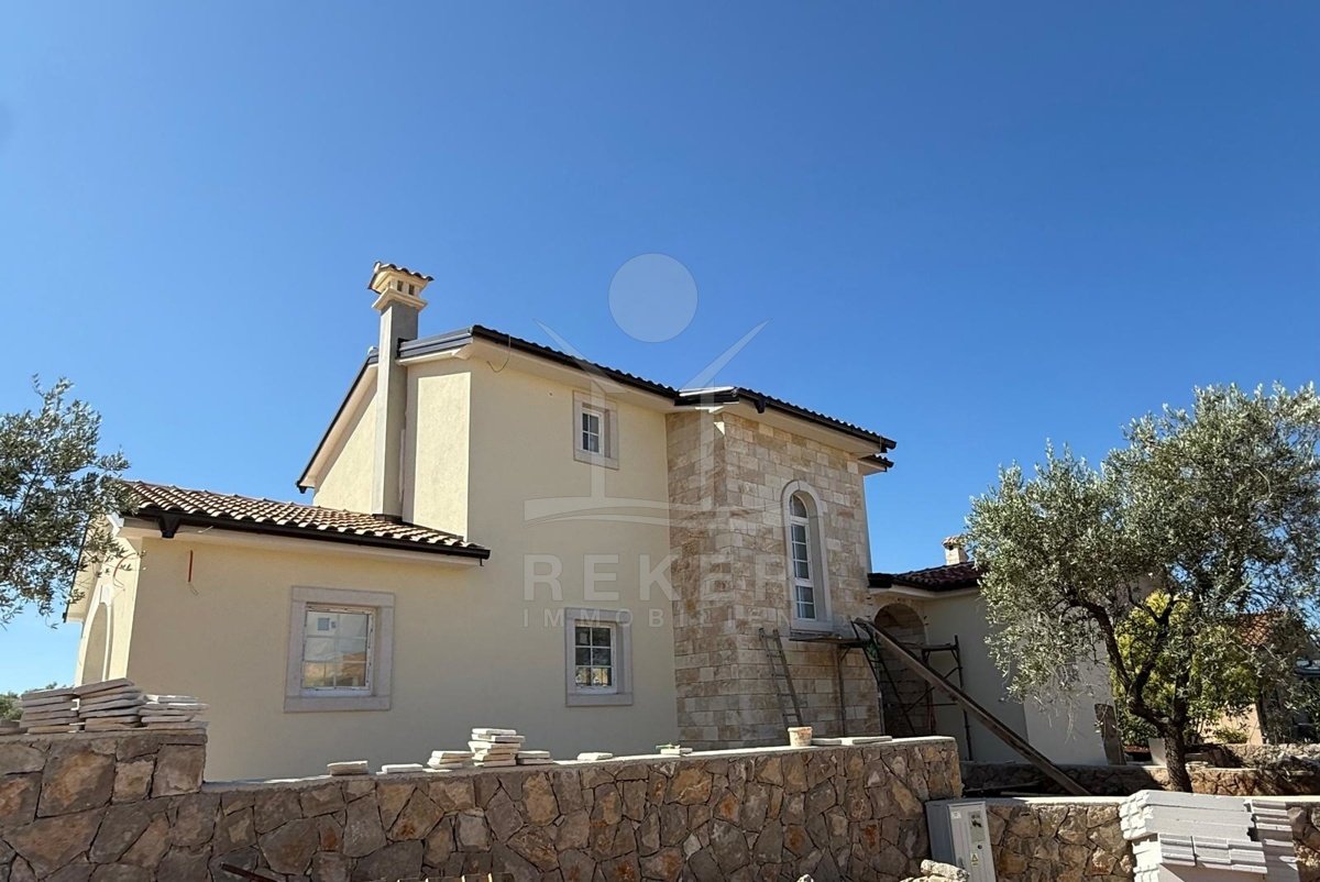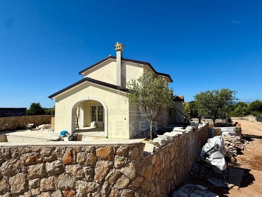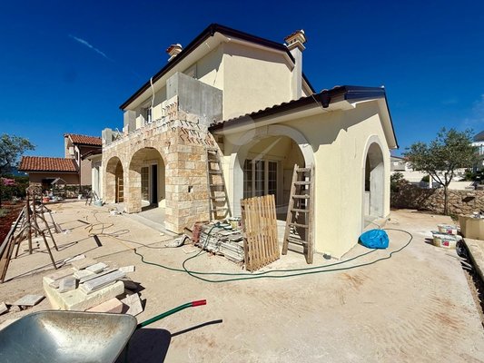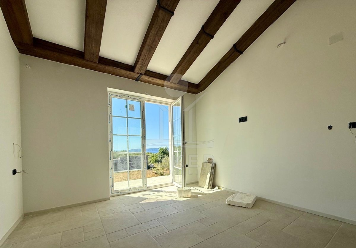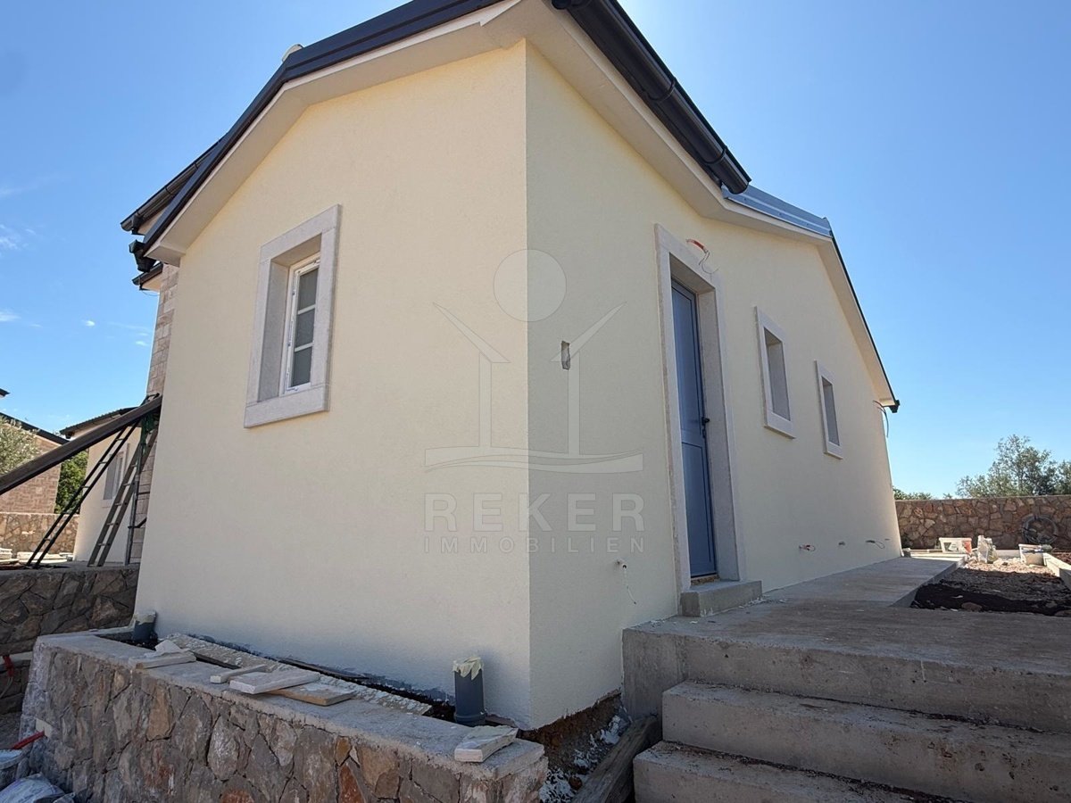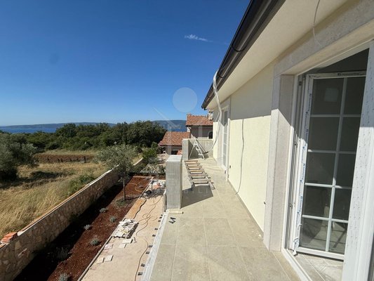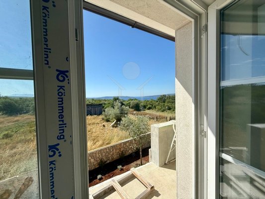 Etwa zwei Kilometer oberhalb der Küste, in der weiteren Umgebung von Krk-Stadt: eine ruhige Wohngegend, gepflegt und locker bebaut, kein Trubel. Stattdessen viel Grün, Platz zum Atmen – und dieser feine Blick aufs Meer. Drei private Parkplätze gehören dazu.