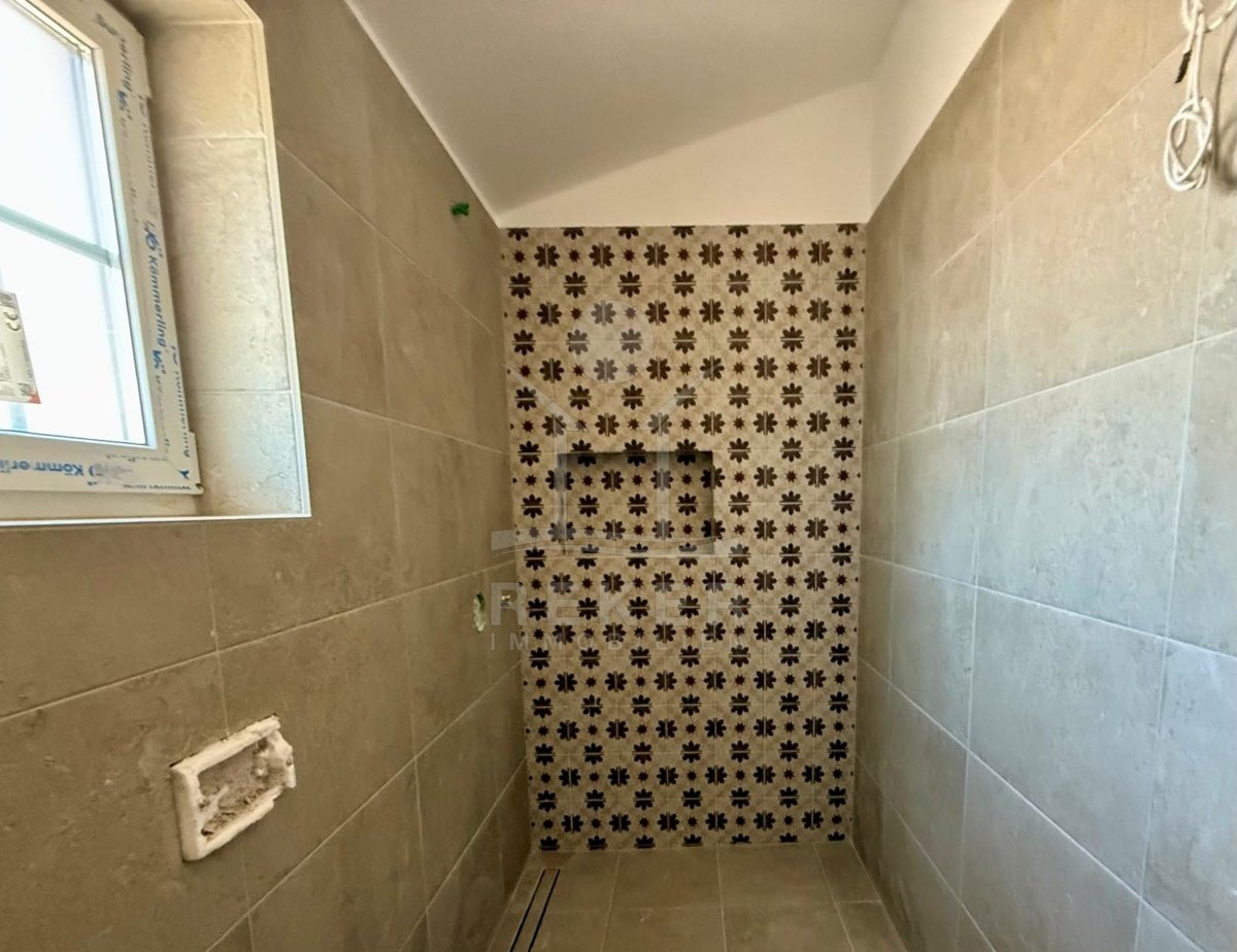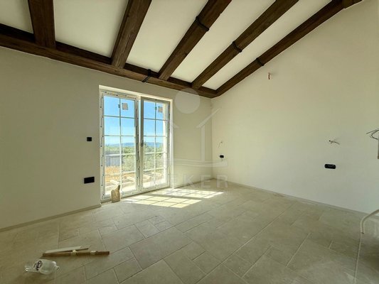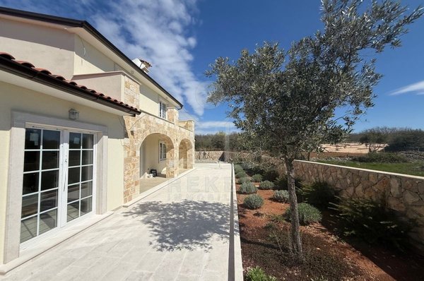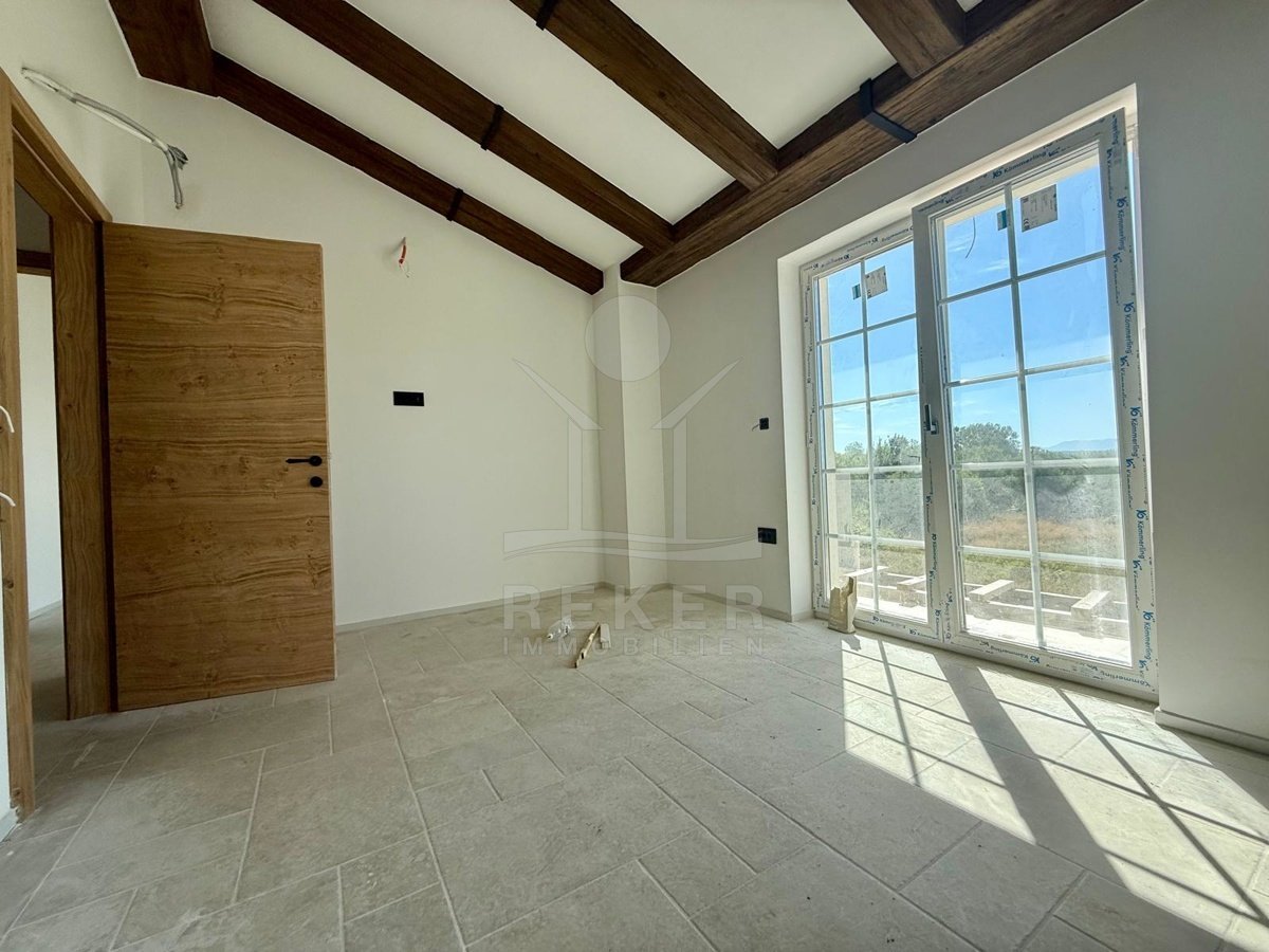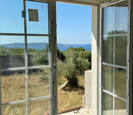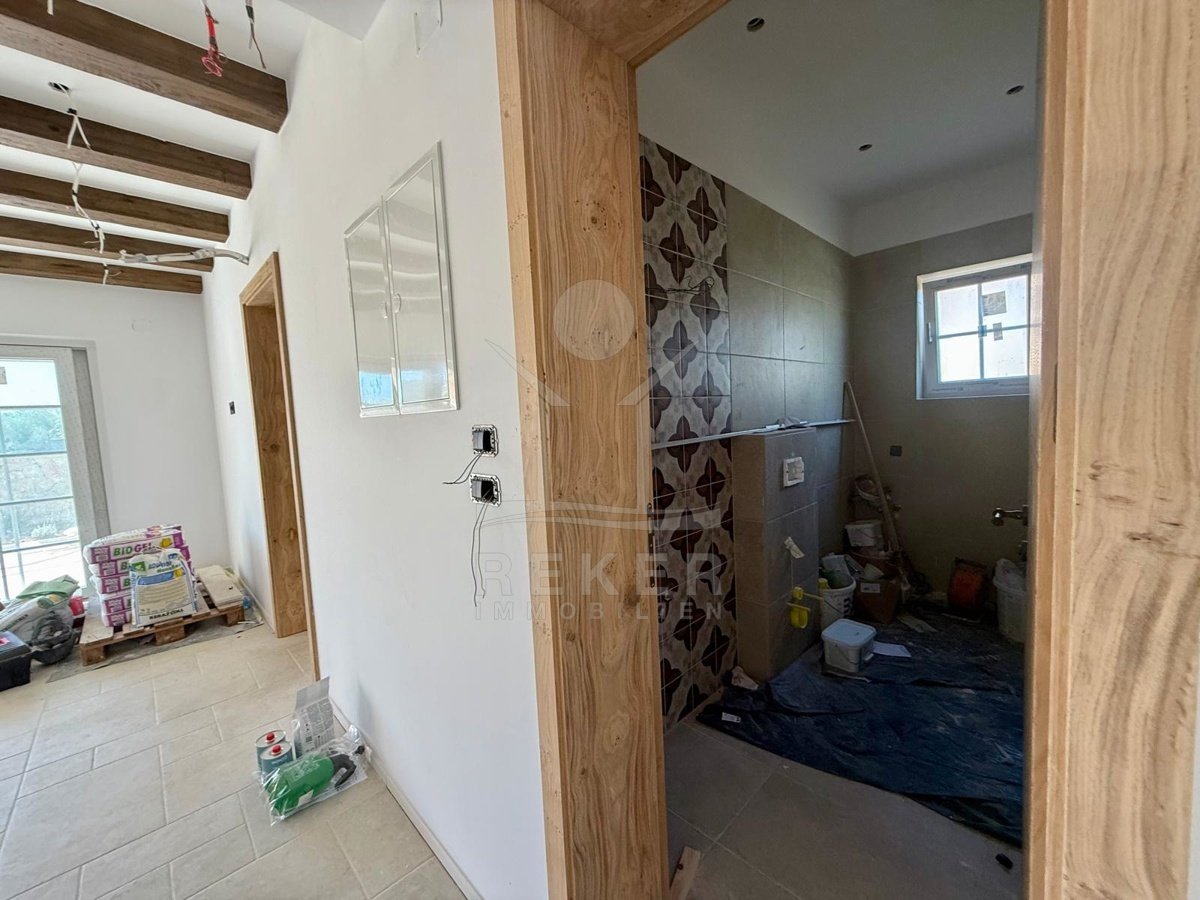 Etwa zwei Kilometer oberhalb der Küste, in der weiteren Umgebung von Krk-Stadt: eine ruhige Wohngegend, gepflegt und locker bebaut, kein Trubel. Stattdessen viel Grün, Platz zum Atmen – und dieser feine Blick aufs Meer. Drei private Parkplätze gehören dazu.