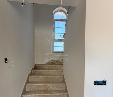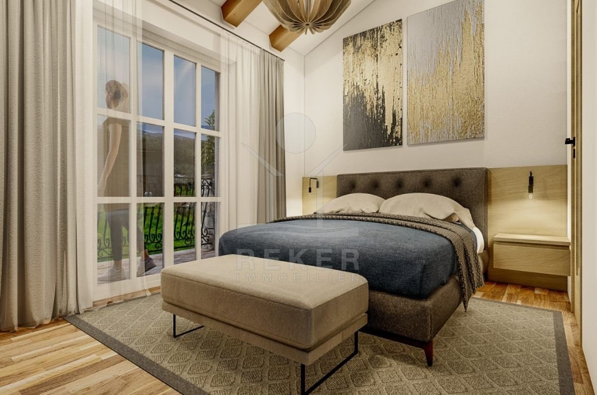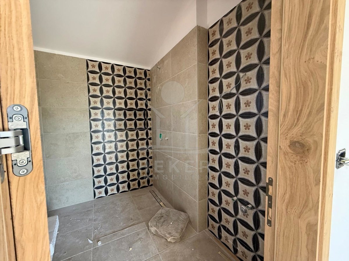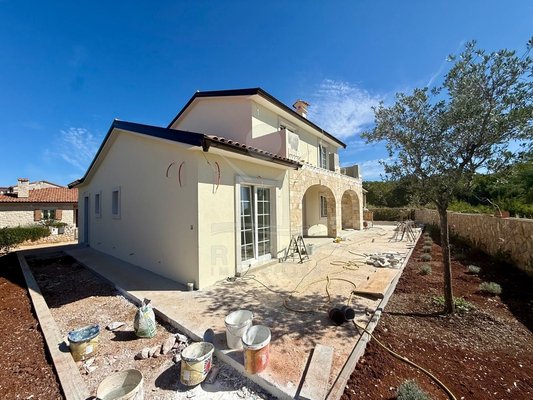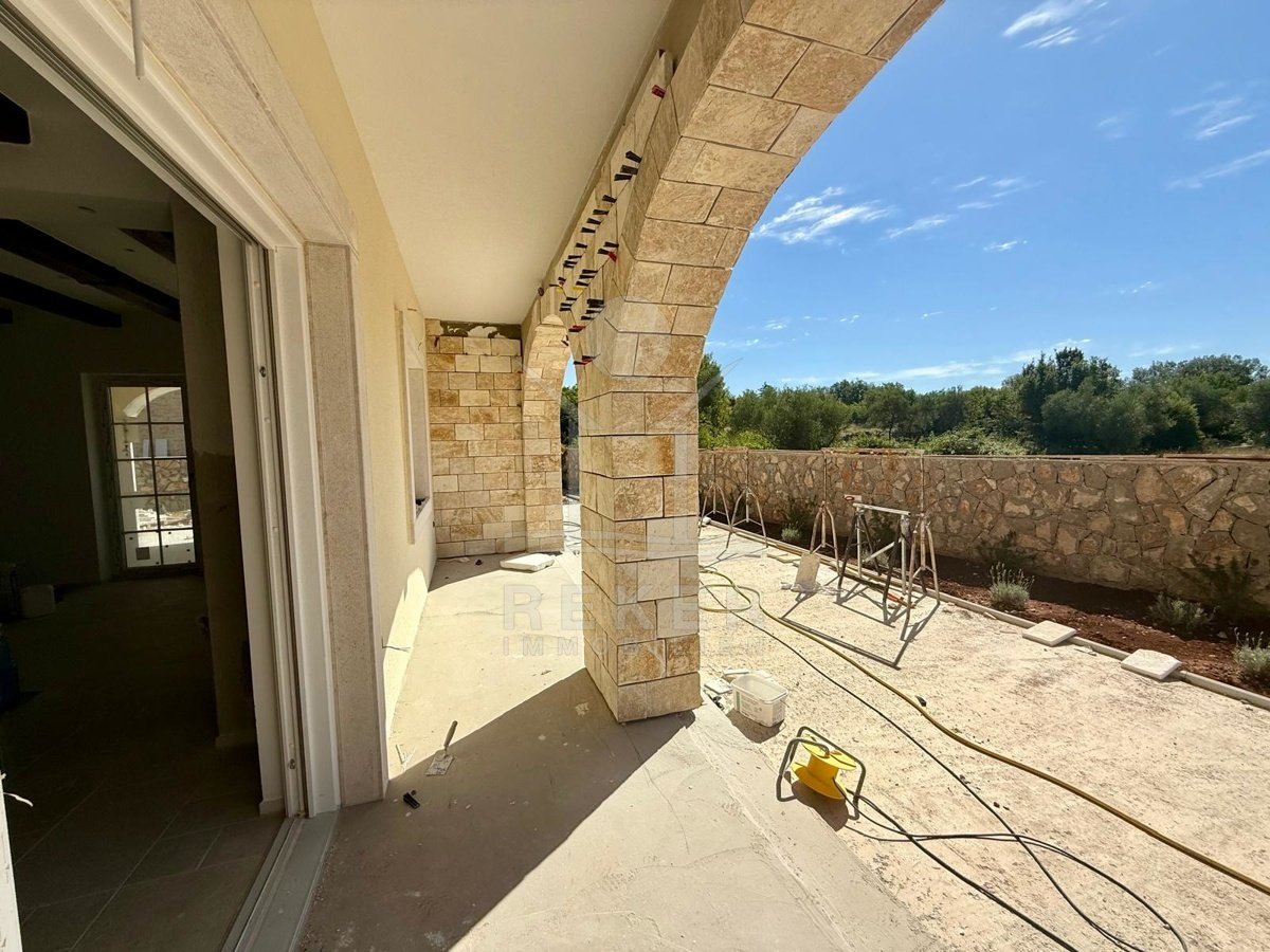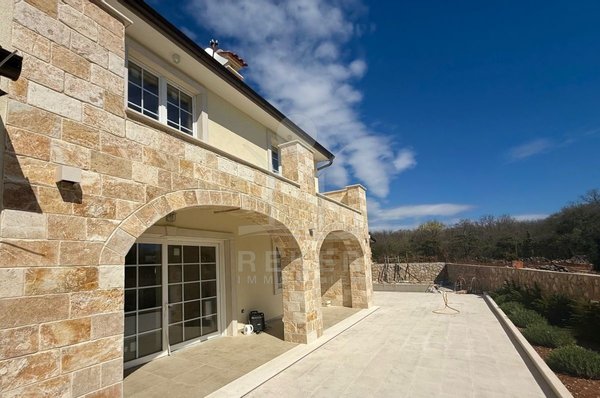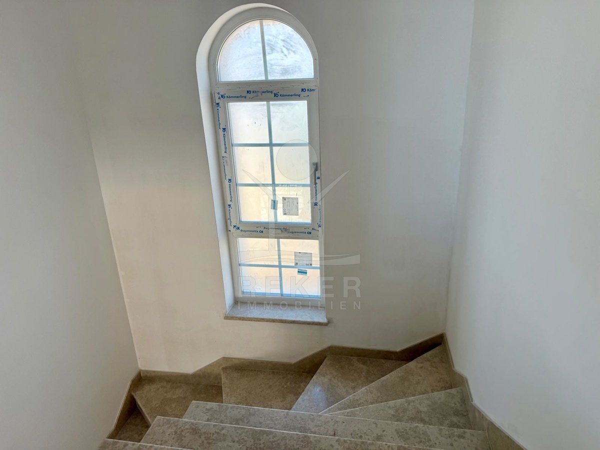 Etwa zwei Kilometer oberhalb der Küste, in der weiteren Umgebung von Krk-Stadt: eine ruhige Wohngegend, gepflegt und locker bebaut, kein Trubel. Stattdessen viel Grün, Platz zum Atmen – und dieser feine Blick aufs Meer. Drei private Parkplätze gehören dazu.