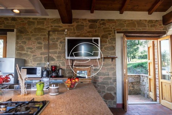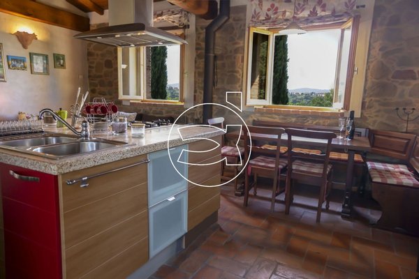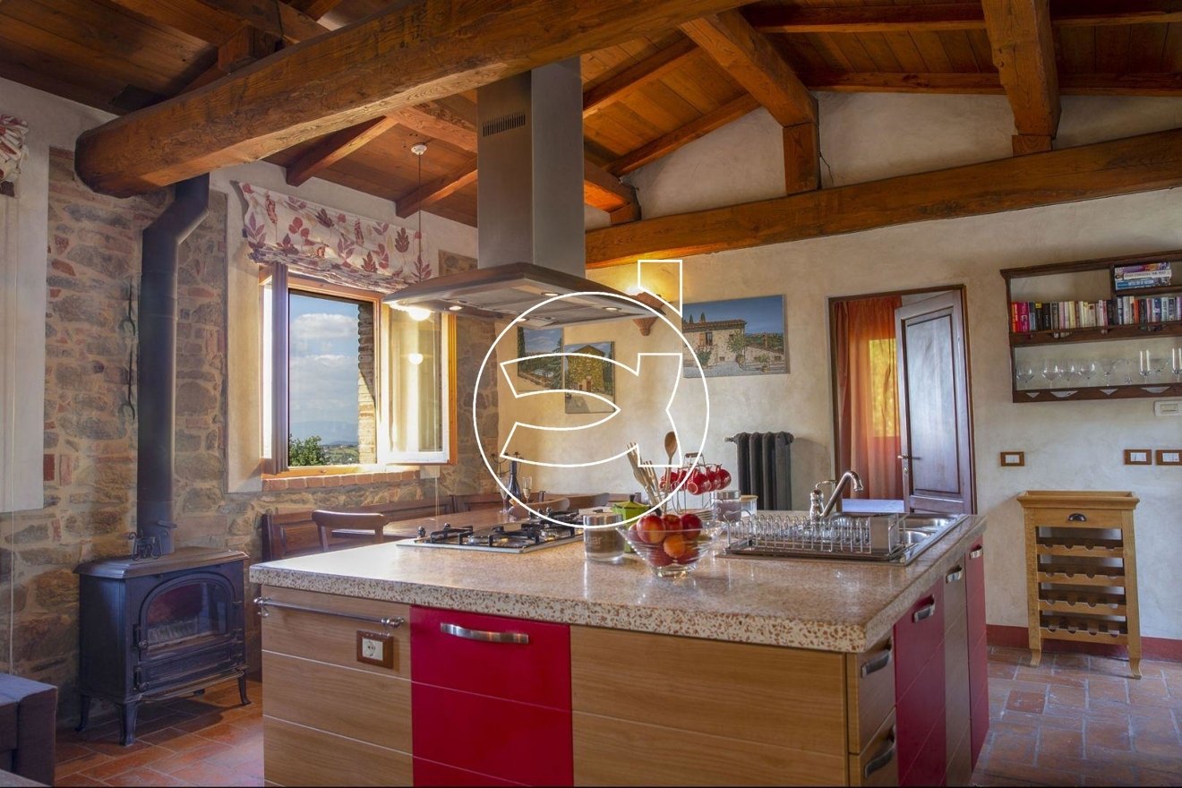 Die Wohnung, komplett im typisch toskanischen rustikalen Stil renoviert, hat Decken mit freiliegenden Holzbalken, Steinmauern und einen atemberaubenden Blick aus jedem Fenster.