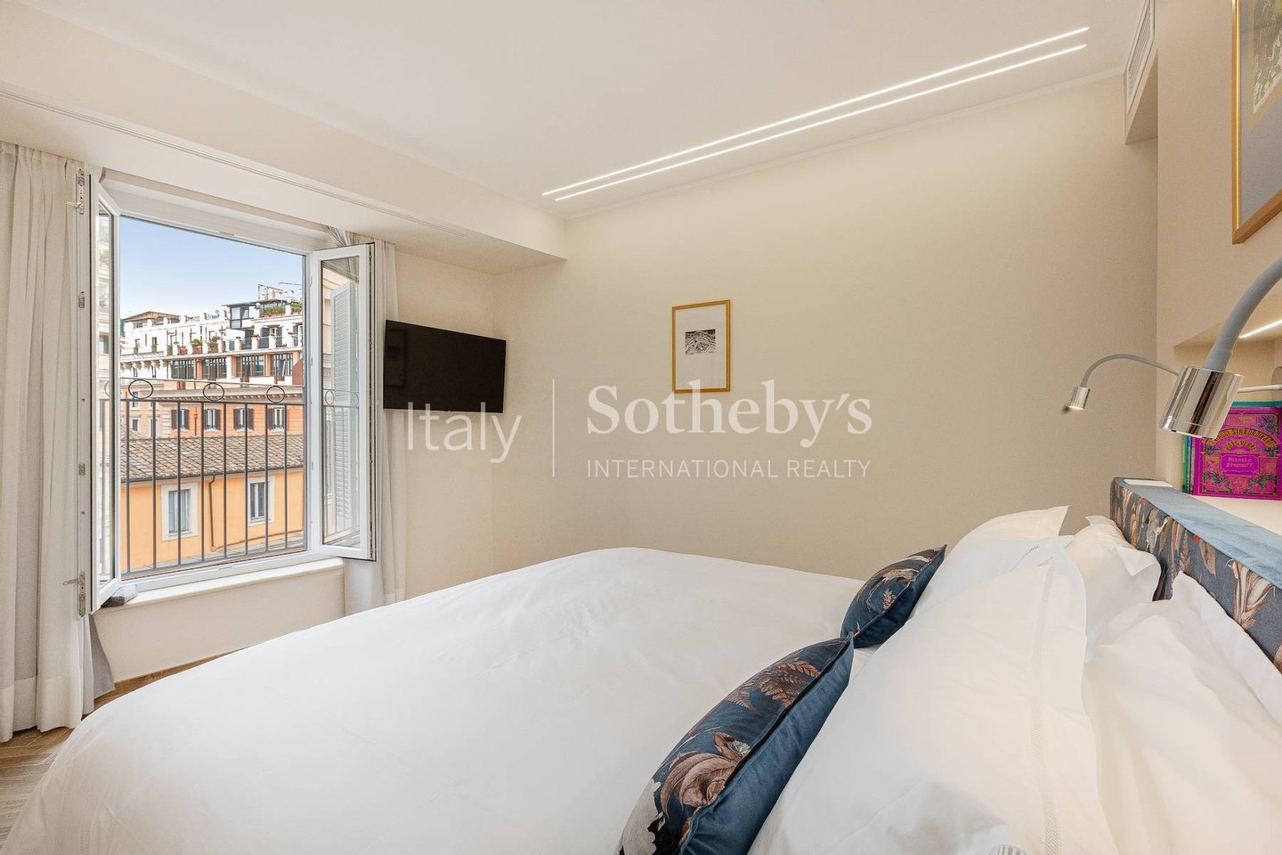 Bedroom 3: King-size bed, bathroom with shower, television, and a large French window with direct access to the balcony overlooking the Trevi Fountain.