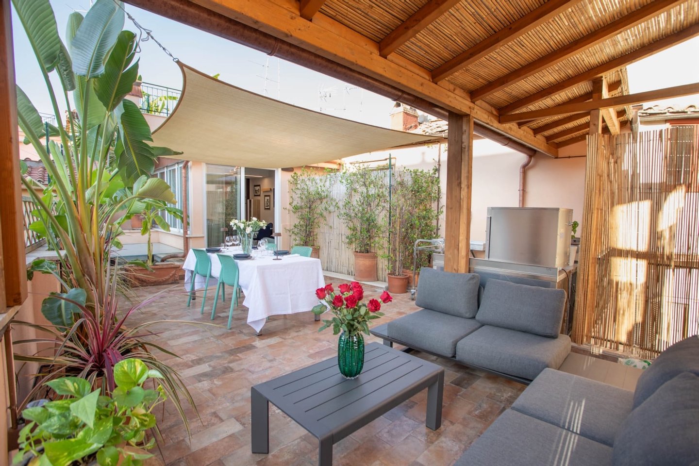 A terrace adjacent to the dining room, over 30 square meters, adorned with beautiful flowering plants, has a large table, sunshade tent, and a large pergola with two comfortable sofas.