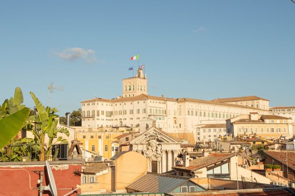 The upper terrace offers a magnificent view of the rooftops of Rome and the Quirinale Palace, the residence of the President of the Italian Republic. This terrace is perfect as a sunbathing area, with comfortable sun chairs, offering the ideal environment for a lively breakfast or a drink under the stars, in every season of the year.