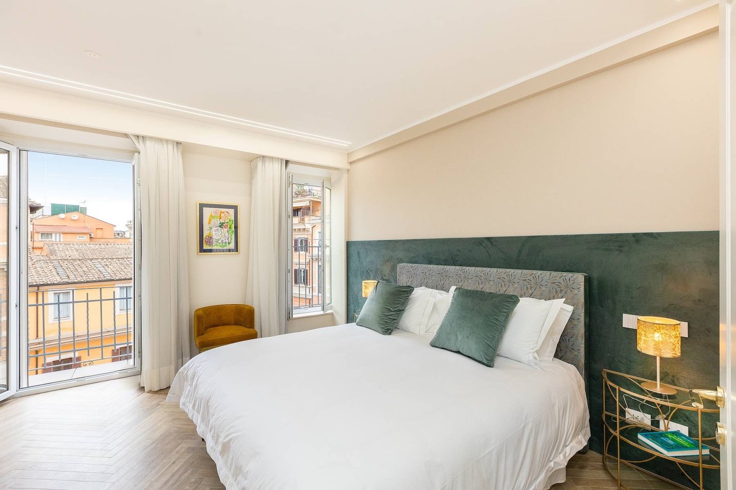 Bedroom 3: King-size bed, bathroom with shower, television, and a large French window with direct access to the balcony overlooking the Trevi Fountain.