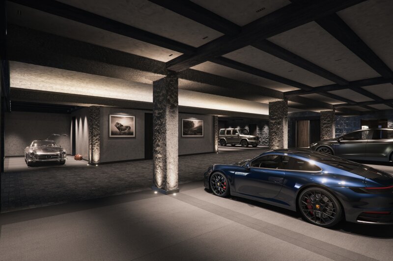 Das Untergeschoss ist eine Oase der Entspannung und Unterhaltung. Ein Fitnessraum mit besten Geräten, ein großzügiger SPA-Bereich, ein Weinkeller mit Bar, ein Heimkino und die Tiefgarage sind selbstverständlich.