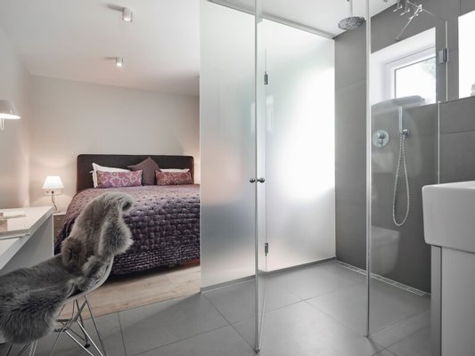 Das Obergeschoss ist derzeit den Eignern vorbehalten mit einem Schlafzimmer samt Ankleide und geräumigen Badezimmer sowie einem privaten Wohnraum, der je nach Bedarf auch anders verwendet werden könnte (Bibliothek, Büro, Fitness etc.). Auch hier erweitern breite Terrassenflächen die Wohnbereiche an warmen Tagen.