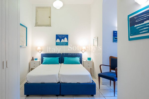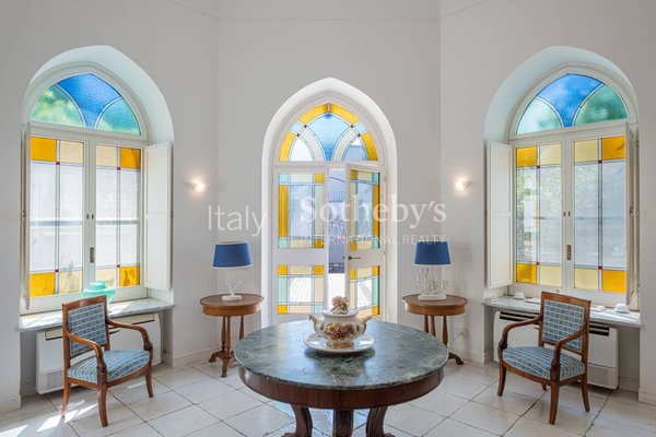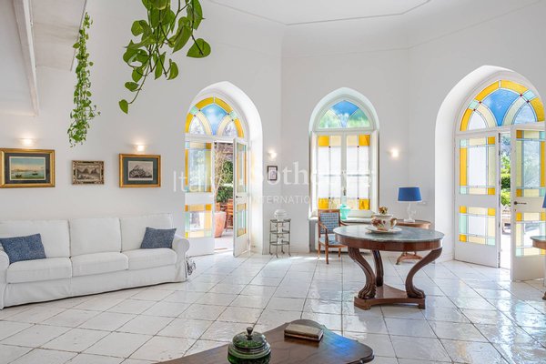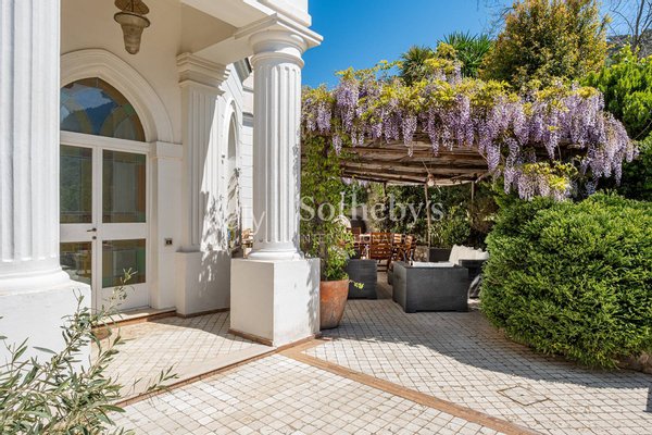 Die weithin veröffentlichte historische Villa "Mein Welt" ist ein hervorragendes Beispiel für die Jugendstil-Architektur. Sie befindet sich im Zentrum von Anacapri und ist bequem mit Taxis und Bussen zu allen Hauptsehenswürdigkeiten der Insel erreichbar, während sie dennoch die Besonderheit aufweist, von Natur und Stille umgeben zu sein. Sobald man durch das Eingangstor tritt, führt der Garten zu einem wunderbaren Gefühl von Ruhe und Entspannung mit seinen Sonnenliegen, Sonnenschirmen, einer Außendusche und dem betörenden Duft von Zitrusfrüchten und Blumen. Unter der Veranda gibt es einen Gesprächsbereich mit Sofas und Sesseln sowie einen Essbereich mit einem großen Tisch, einem Grill und einem Designer-Holzofen für Pizza. Das Haupthaus verfügt über ein großes und helles Wohnzimmer sowie eine voll ausgestattete Küche. Es gibt auch drei Schlafzimmer, jedes mit eigenem Bad. In der Dependance gibt es eine zweite Küche, einen Schlaf- und Gesprächsbereich, ein Badezimmer und einen Hauswirtschaftsraum. Im gesamten Haus gibt es eine Klimaanlage mit Wärmepumpe (heiß/kalt). Ein Parkplatz und ein Rollerparkplatz vervollständigen die Immobilie.