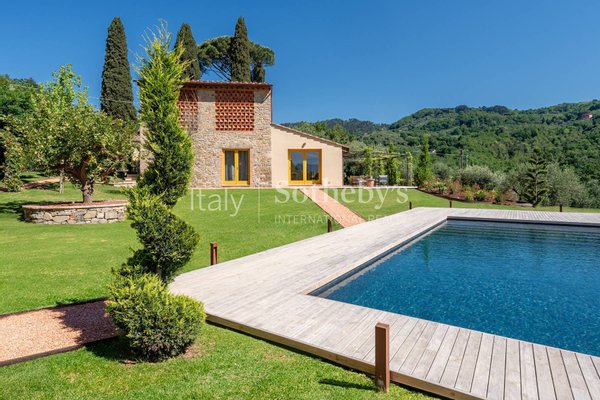 Bezaubernde Residenz, ein verborgenes Juwel unter den renommierten Hügeln von Lucca, umgeben von Olivenhainen und Weinbergen, die eine zeitlose Landschaft zeichnen. Mit einer Fläche von etwa 2,5 Hektar zeichnet sich dieses Anwesen durch seine Größe aus und empfängt Besucher in einer Atmosphäre raffinierter Eleganz.