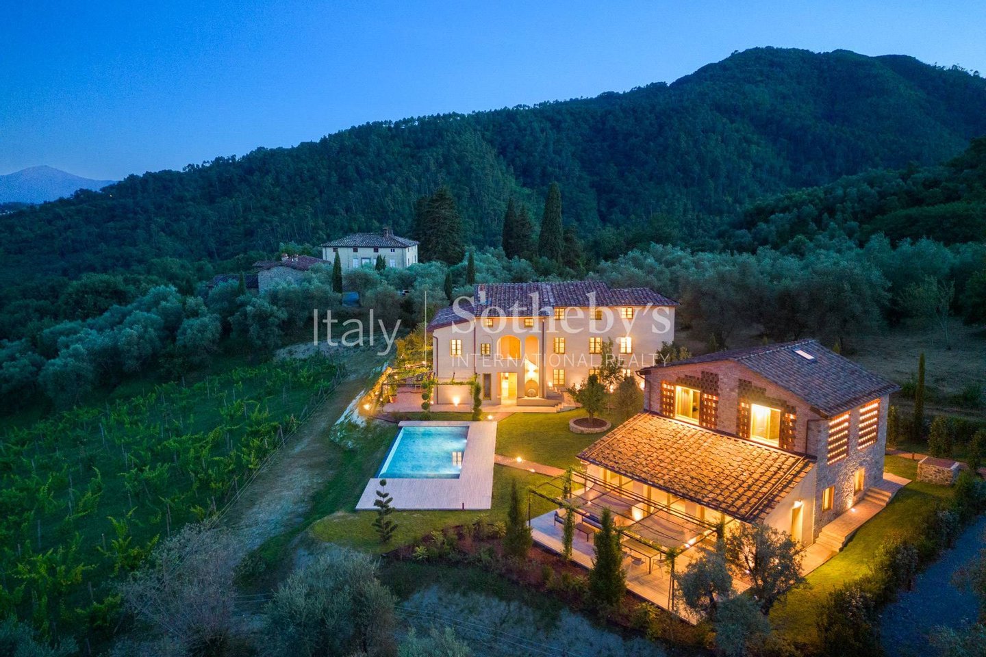 Bezaubernde Residenz, ein verborgenes Juwel unter den renommierten Hügeln von Lucca, umgeben von Olivenhainen und Weinbergen, die eine zeitlose Landschaft zeichnen. Mit einer Fläche von etwa 2,5 Hektar zeichnet sich dieses Anwesen durch seine Größe aus und empfängt Besucher in einer Atmosphäre raffinierter Eleganz.