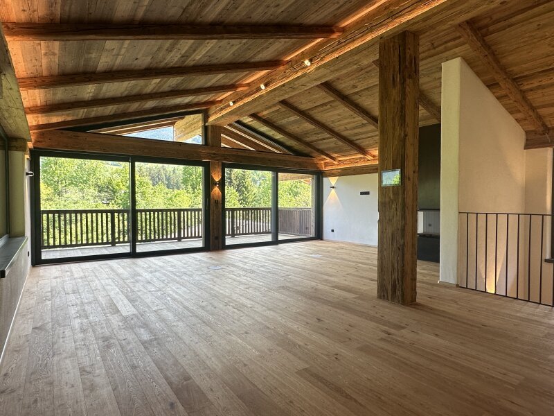 Das eigentliche Herzstück der Immobilie, der über 70 Quadratmeter große Wohn-Essbereich, befindet sich im Dachgeschoss. Die durchgehende, südwestliche, bodentiefe Glasfront sorgt für ausgesprochen viel Tageslicht. Der herrliche Ausblick in die umgebende Bergwelt zieht in seinen Bann. Die Profiküche mit Fronten aus Altholz und Geräten von Bora Professionell und Gaggenau ist im Kaufpreis enthalten, perfekt ins wohldurchdachte Wohnkonzept integriert und erfreut Hobbyköche genauso wie Profiköche. Erwähnenswert sind sicherlich der von Meisterhand gefertigte Altholzsichtdachstuhl, der ausgesprochen stylisch gestaltete Kamin, die groß dimensionierte Terrasse und der gemütliche Balkon. Eine Gästetoilette und eine praktische Speis komplettieren das Wohnerlebnis.