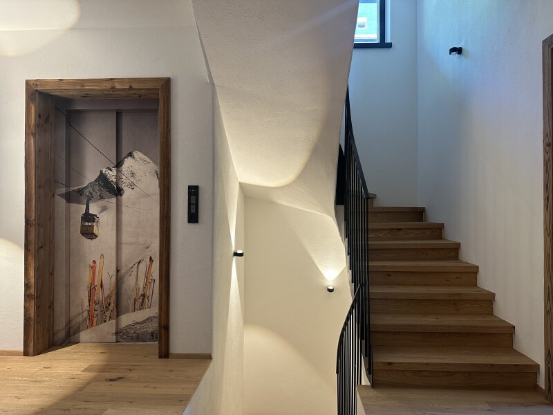 Über den Personenlift oder die repräsentative Treppe kommt man ins Erdgeschoß.