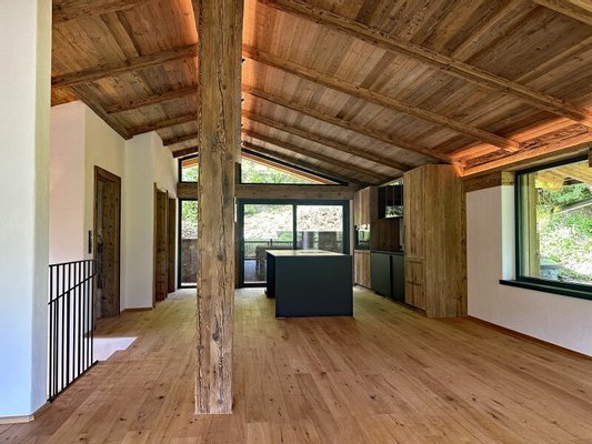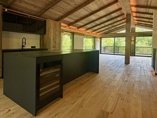 Das eigentliche Herzstück der Immobilie, der über 70 Quadratmeter große Wohn-Essbereich, befindet sich im Dachgeschoss. Die durchgehende, südwestliche, bodentiefe Glasfront sorgt für ausgesprochen viel Tageslicht. Der herrliche Ausblick in die umgebende Bergwelt zieht in seinen Bann. Die Profiküche mit Fronten aus Altholz und Geräten von Bora Professionell und Gaggenau ist im Kaufpreis enthalten, perfekt ins wohldurchdachte Wohnkonzept integriert und erfreut Hobbyköche genauso wie Profiköche. Erwähnenswert sind sicherlich der von Meisterhand gefertigte Altholzsichtdachstuhl, der ausgesprochen stylisch gestaltete Kamin, die groß dimensionierte Terrasse und der gemütliche Balkon. Eine Gästetoilette und eine praktische Speis komplettieren das Wohnerlebnis.